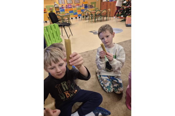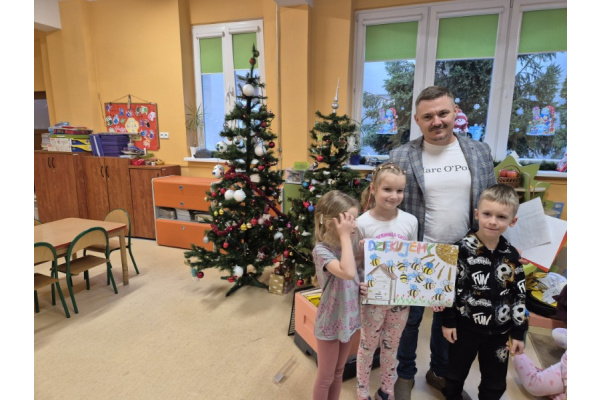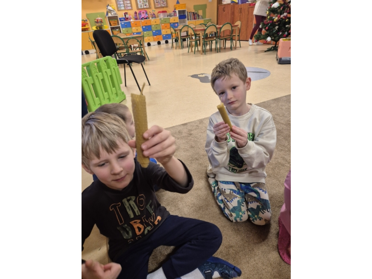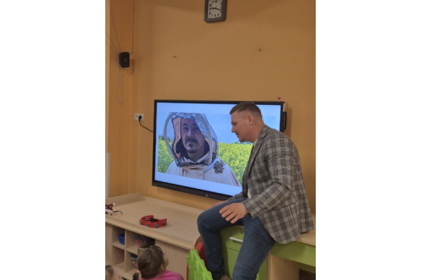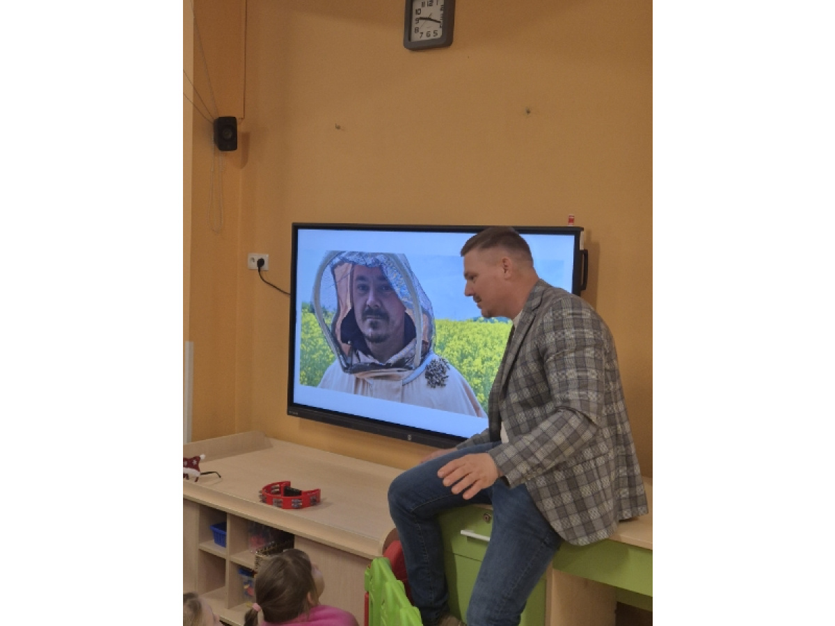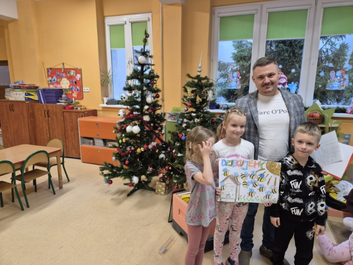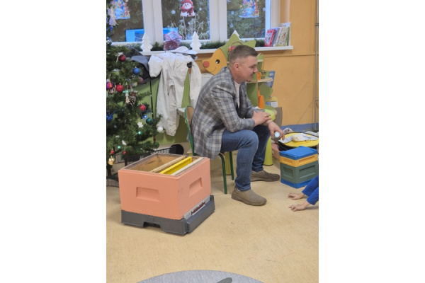W czwartek 4 grudnia nasze przedszkole odwiedził wyjątkowy gość – pszczelarz z pasji i zamiłowania. Podczas spotkania dzieci miały okazję zobaczyć z bliska strój ochronny, narzędzia używane w pasiece oraz specjalną ramkę z woskiem pszczelim. Przedszkolaki dowiedziały się, jak wygląda życie pszczół, w jaki sposób powstaje miód i dlaczego te małe owady są tak ważne dla przyrody.