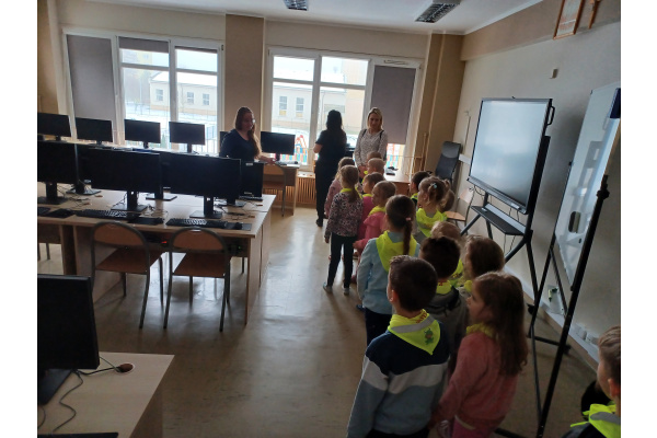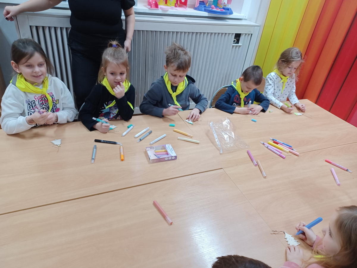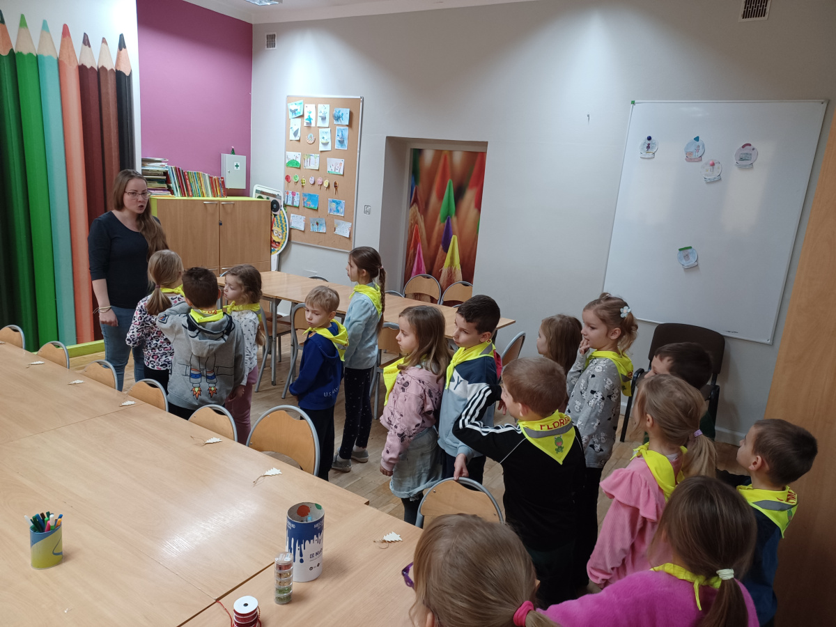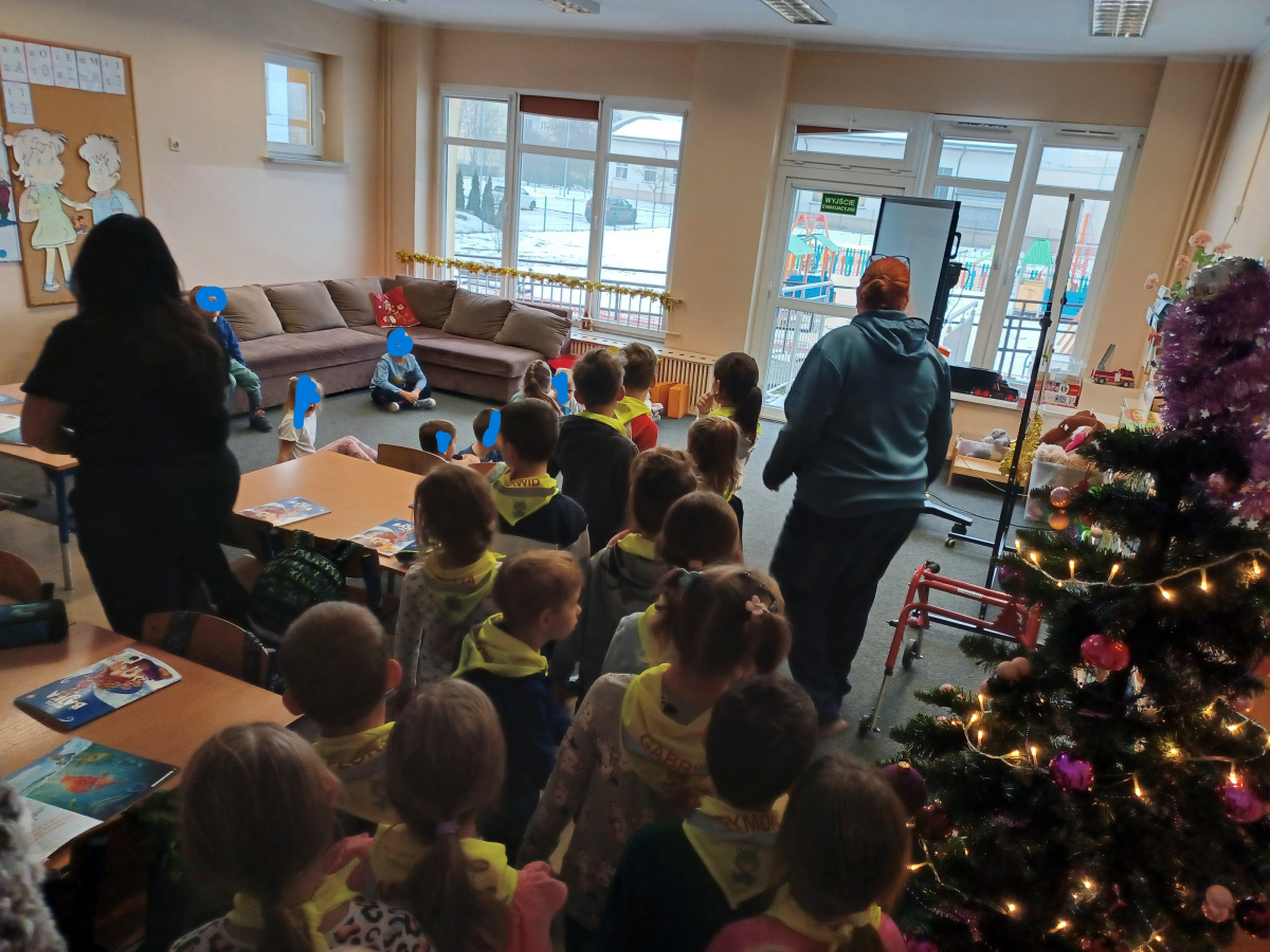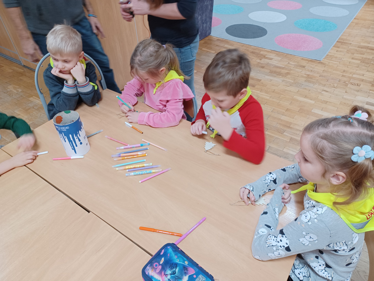 2. grudnia Żabki udały się z wizytą do Szkoły Podstawowej nr 65 Filia. Naszym przewodnikiem w budynku była pani Monika, która oprowadziła nas i pokazała nam różne pomieszczenia w szkole, opowiedziała, jakie zajęcia odbywają się w poszczególnych klasach. Na koniec udaliśmy się do świetlicy, w której wzięliśmy udział w zajęciach plastycznych. Dzieci wykonały piękne ozdoby choinkowe. Wizyta w szkole była wielkim przeżyciem dla przedszkolaków, a największe wrażenie zrobiła sala komputerowa. Serdecznie dziękujemy za zaproszenie, oprowadzenie i zajęcia!