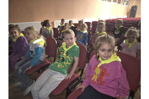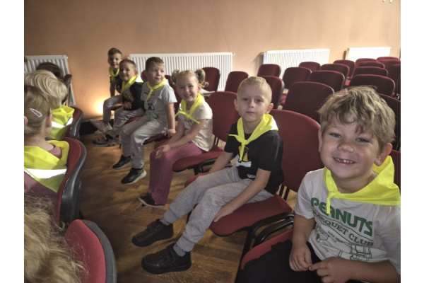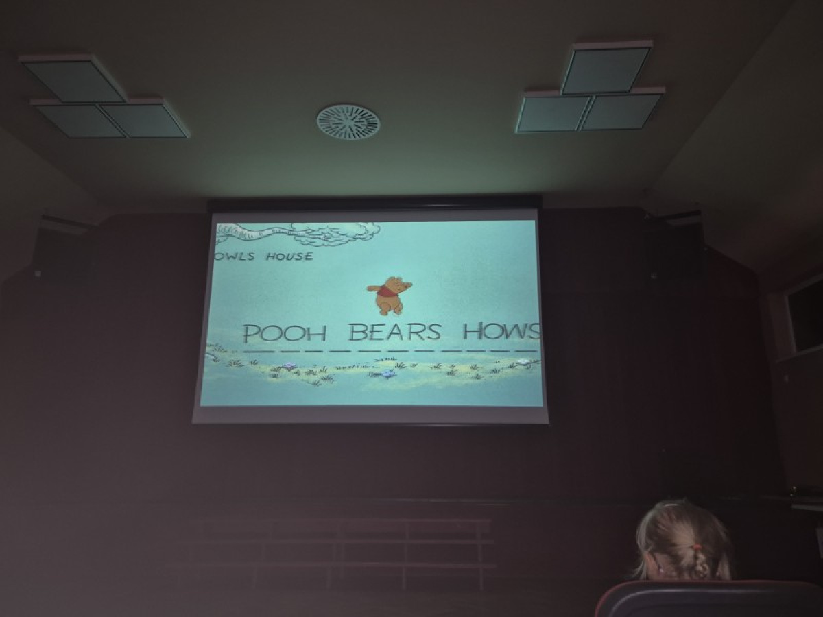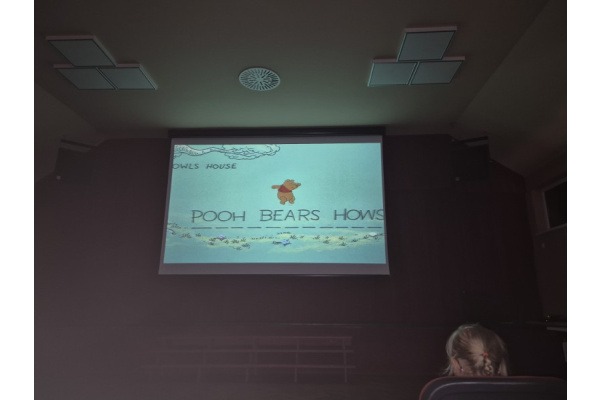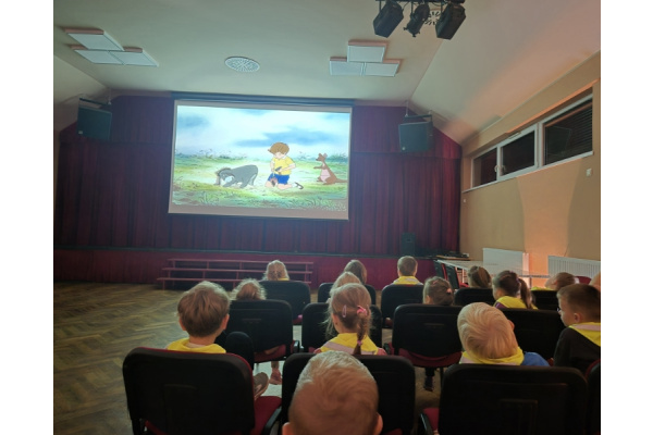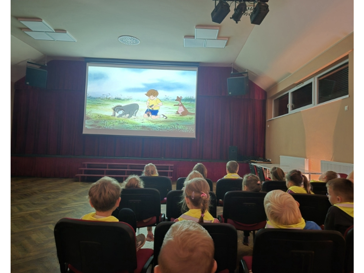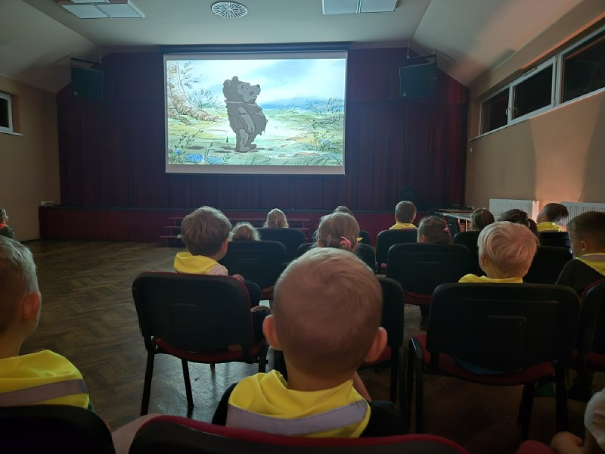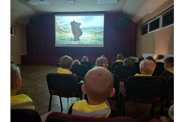 "Zajączki" udały się na pieszą wycieczkę w celu obejrzenia bajek. Podczas seansu filmowego dzieci poznały przygody Kubusia Puchatka i jego przyjaciół. Dużo humoru i wartości wychowawcze bajek rozbudziły zainteresowanie małych widzów. Wycieczka była okazją do utrwalenia zasad bezpiecznego poruszania się po ulicy.