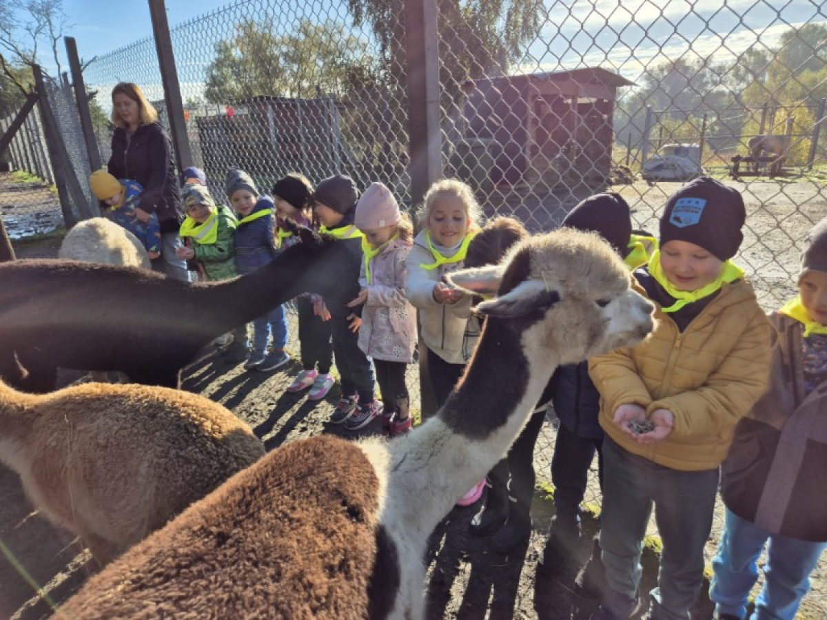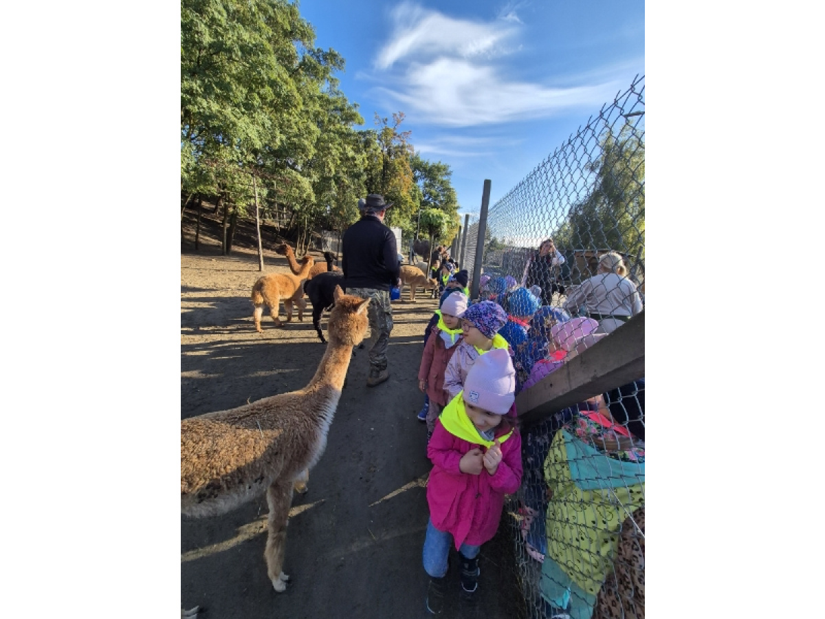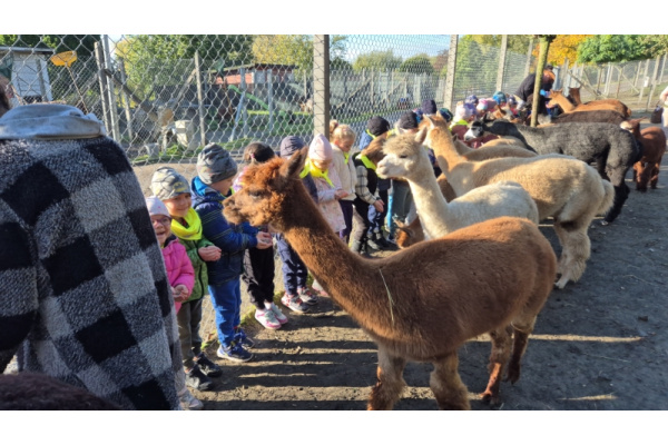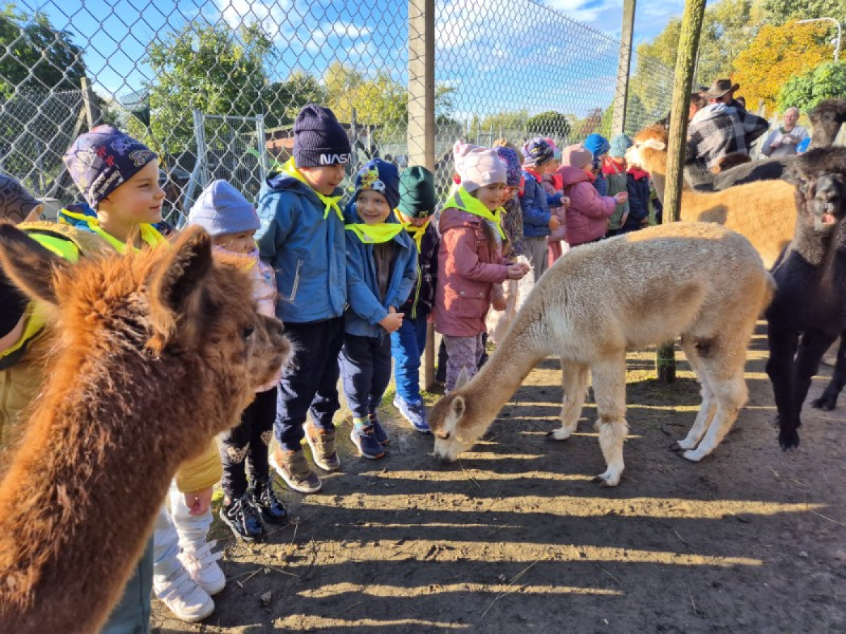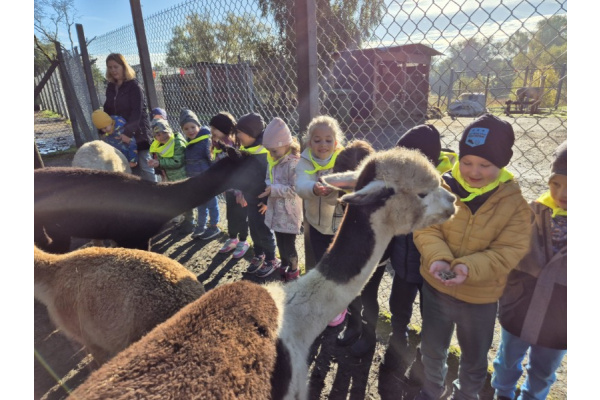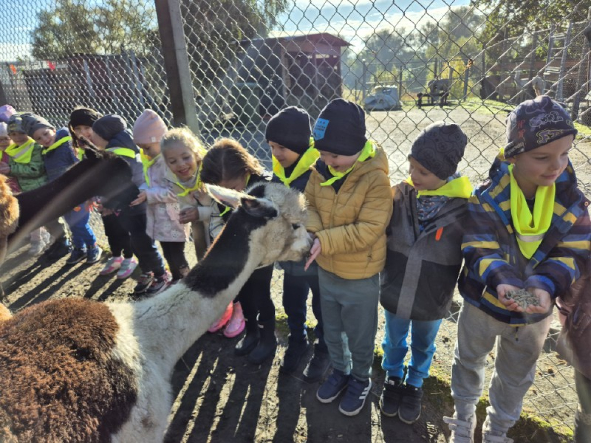 Wyjazd autokarem z przedszkola to duże przeżycie dla dzieci. Dlatego już dużo wcześniej przedszkolacy przygotowywali się do wycieczki. Po przyjeździe na miejsce dzieci miały możliwość obcowania ze zwierzętami, karmić je. Dowiedziały się ciekawostek na temat życia alpak, kóz, osła, wielbłąda , kangura, koni. Przedszkolacy uczestniczyli w zajęciach plastycznych , przejażdżce traktorem a także zabawach ruchowych na świeżym powietrzu. Uśmiechy nie znikały z twarzy dzieci, które w promieniach jesiennego słońca bezpiecznie wróciły do przedszkola.