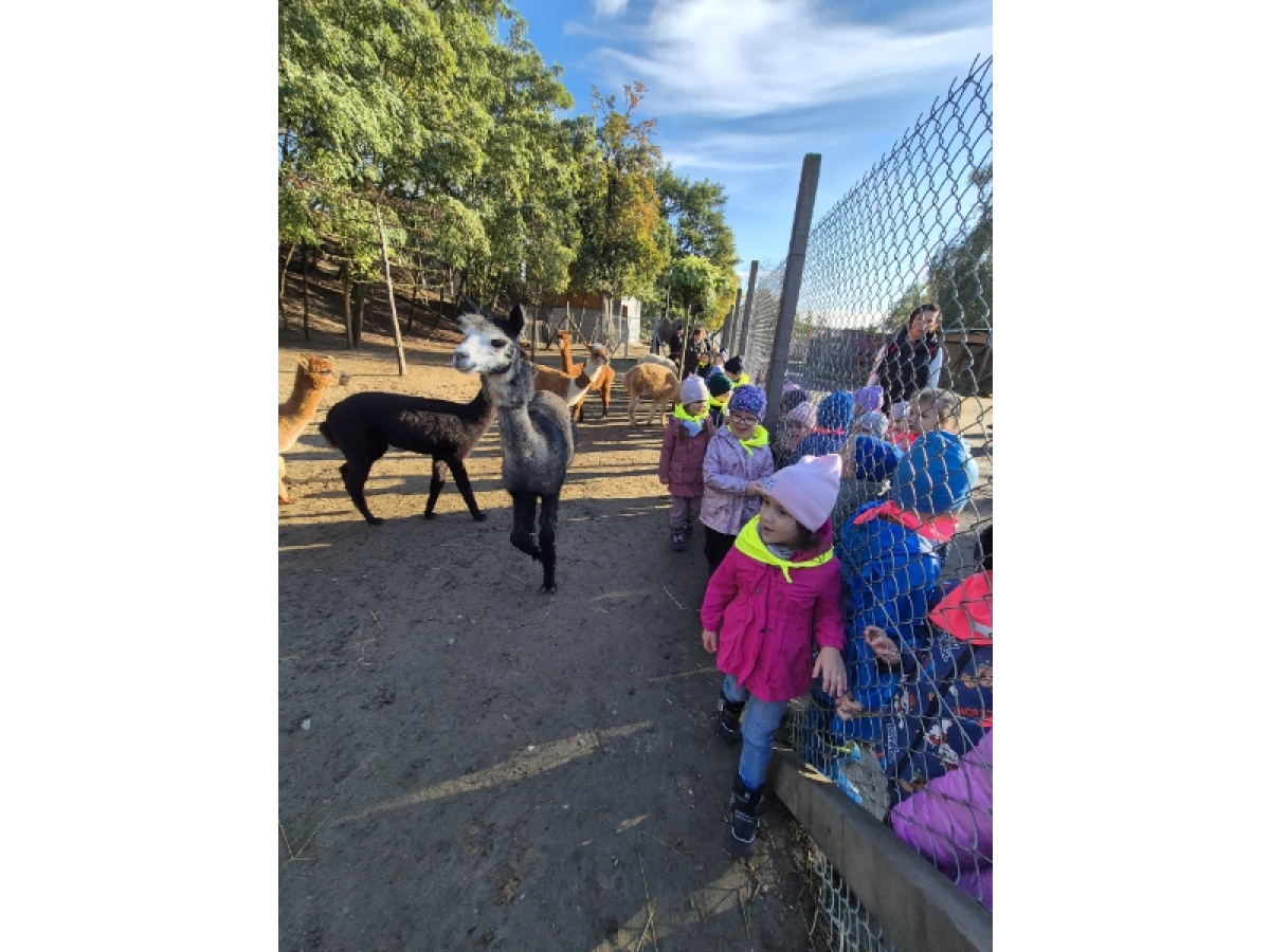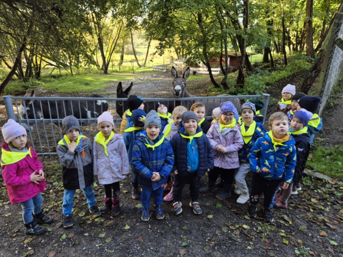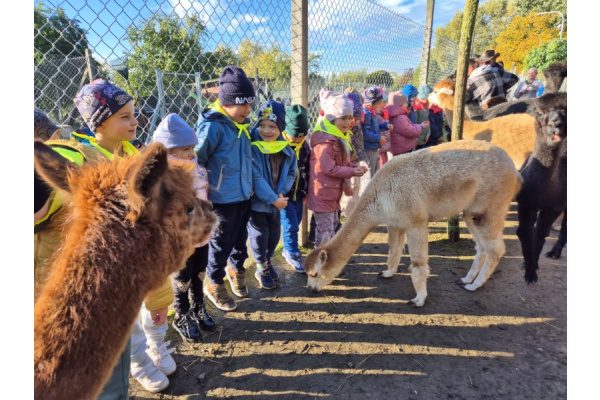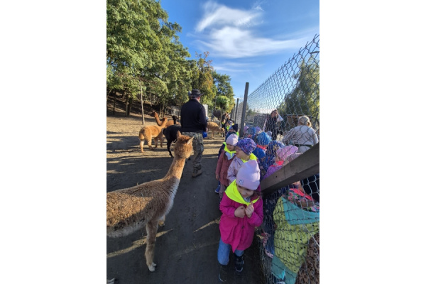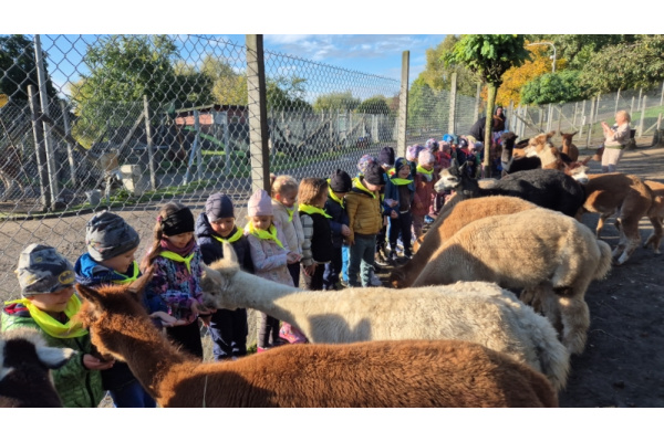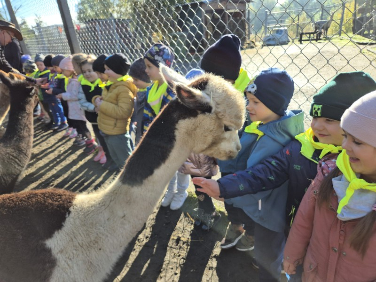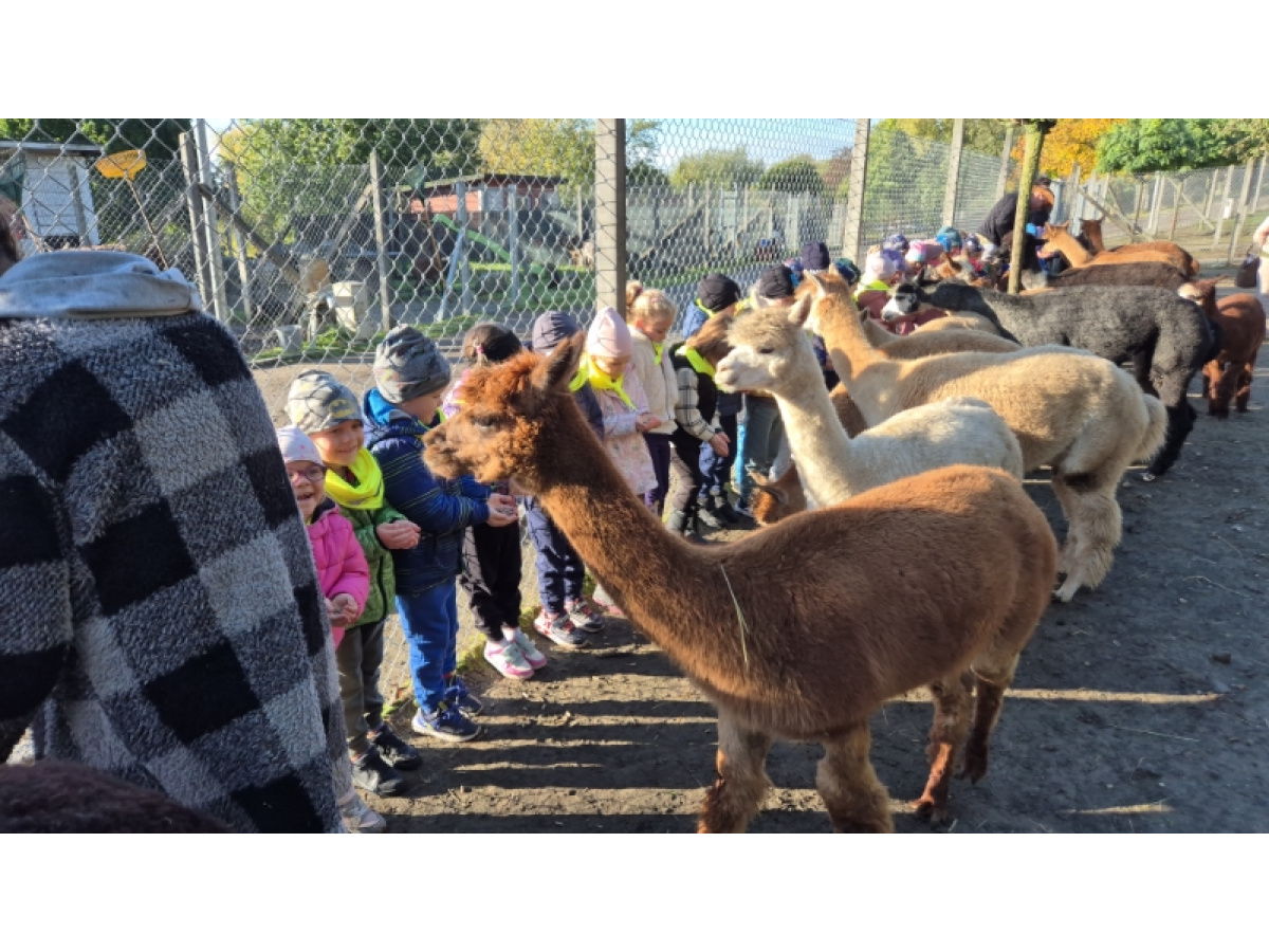 Wyjazd autokarem z przedszkola to duże przeżycie dla dzieci. Dlatego już dużo wcześniej przedszkolacy przygotowywali się do wycieczki. Po przyjeździe na miejsce dzieci miały możliwość obcowania ze zwierzętami, karmić je. Dowiedziały się ciekawostek na temat życia alpak, kóz, osła, wielbłąda , kangura, koni. Przedszkolacy uczestniczyli w zajęciach plastycznych , przejażdżce traktorem a także zabawach ruchowych na świeżym powietrzu. Uśmiechy nie znikały z twarzy dzieci, które w promieniach jesiennego słońca bezpiecznie wróciły do przedszkola.