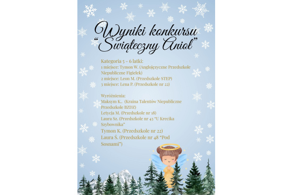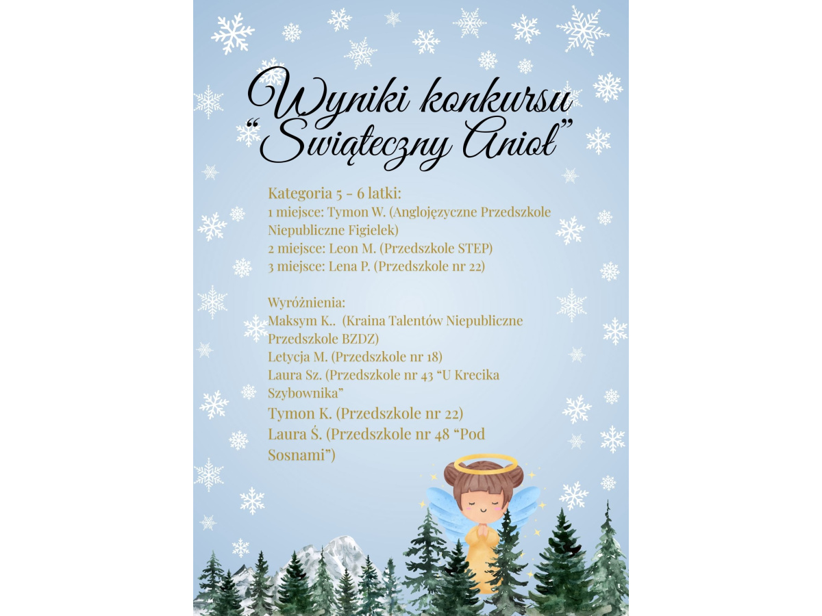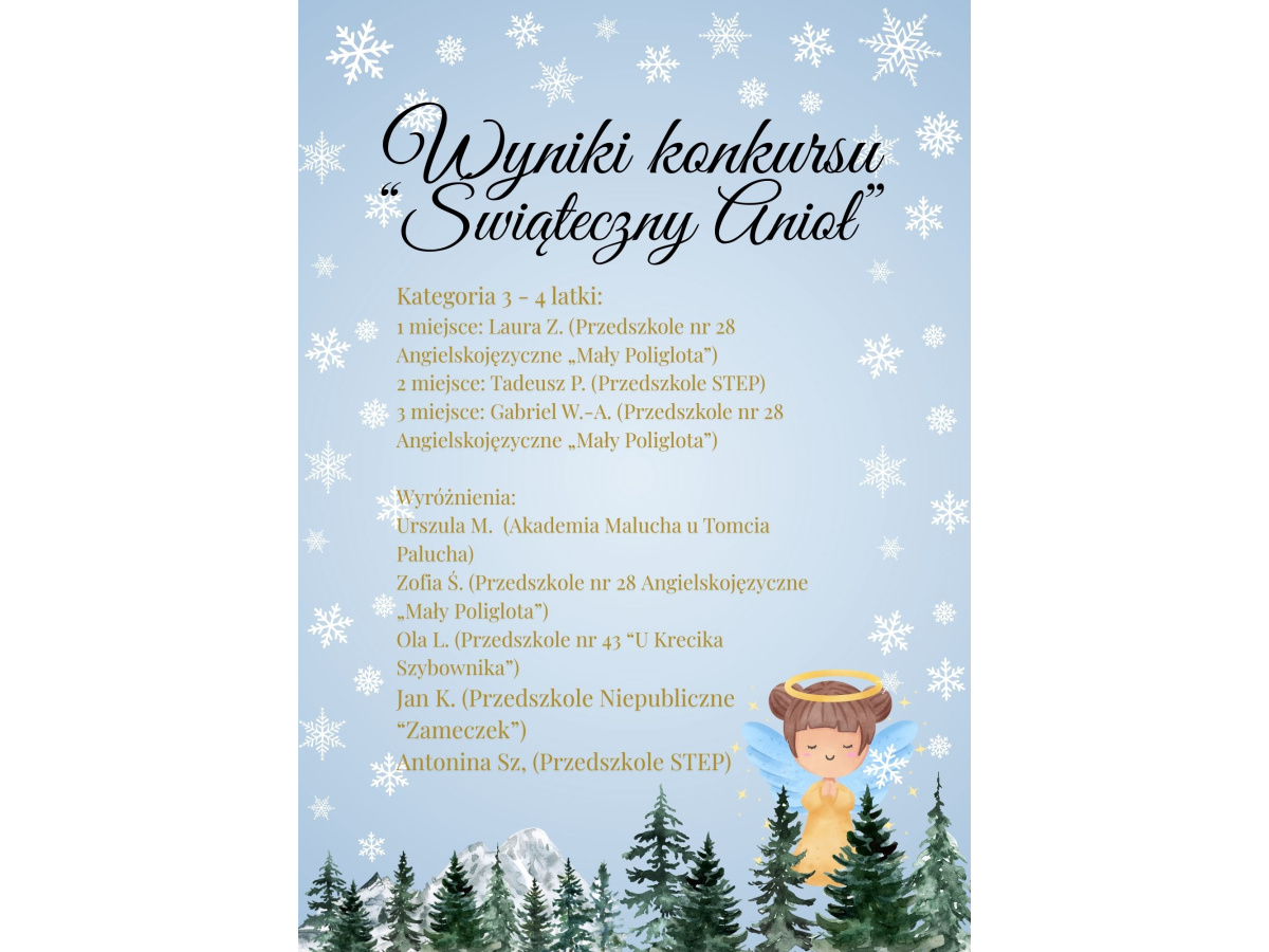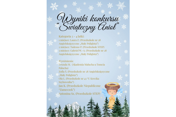 Poniżej prezentujemy wyniki Międzyprzedszkolnego konkursu plastycznego "Świąteczny Anioł". Serdecznie dziękujemy za każdą pracę oraz okazane zaangażowanie rodziców i pracowników każdego z przedszkoli. Łącznie w konkursie wzięło udział 90 prac z dziesięciu różnych placówek. Każdy uczestnik otrzyma imienne podziękowanie oraz drobny upominek.
