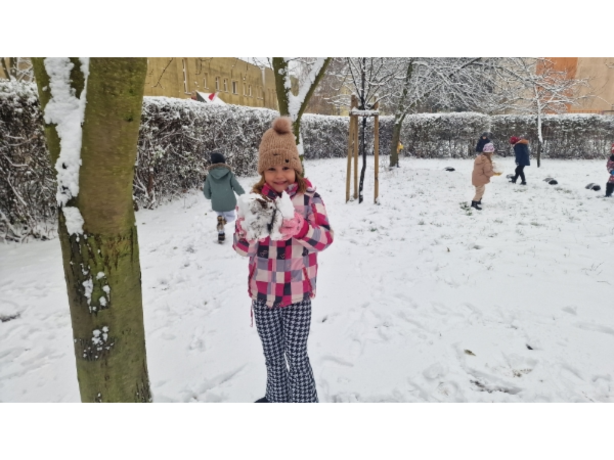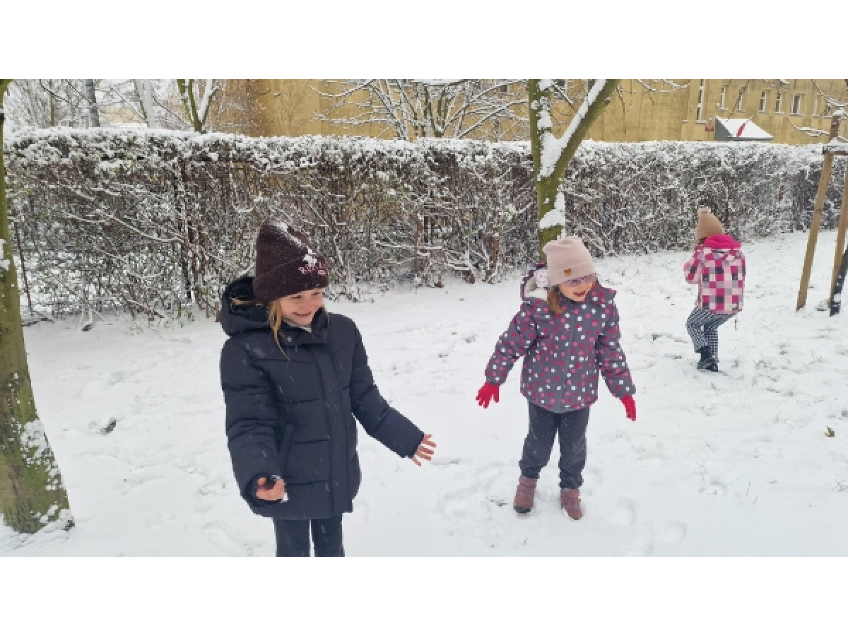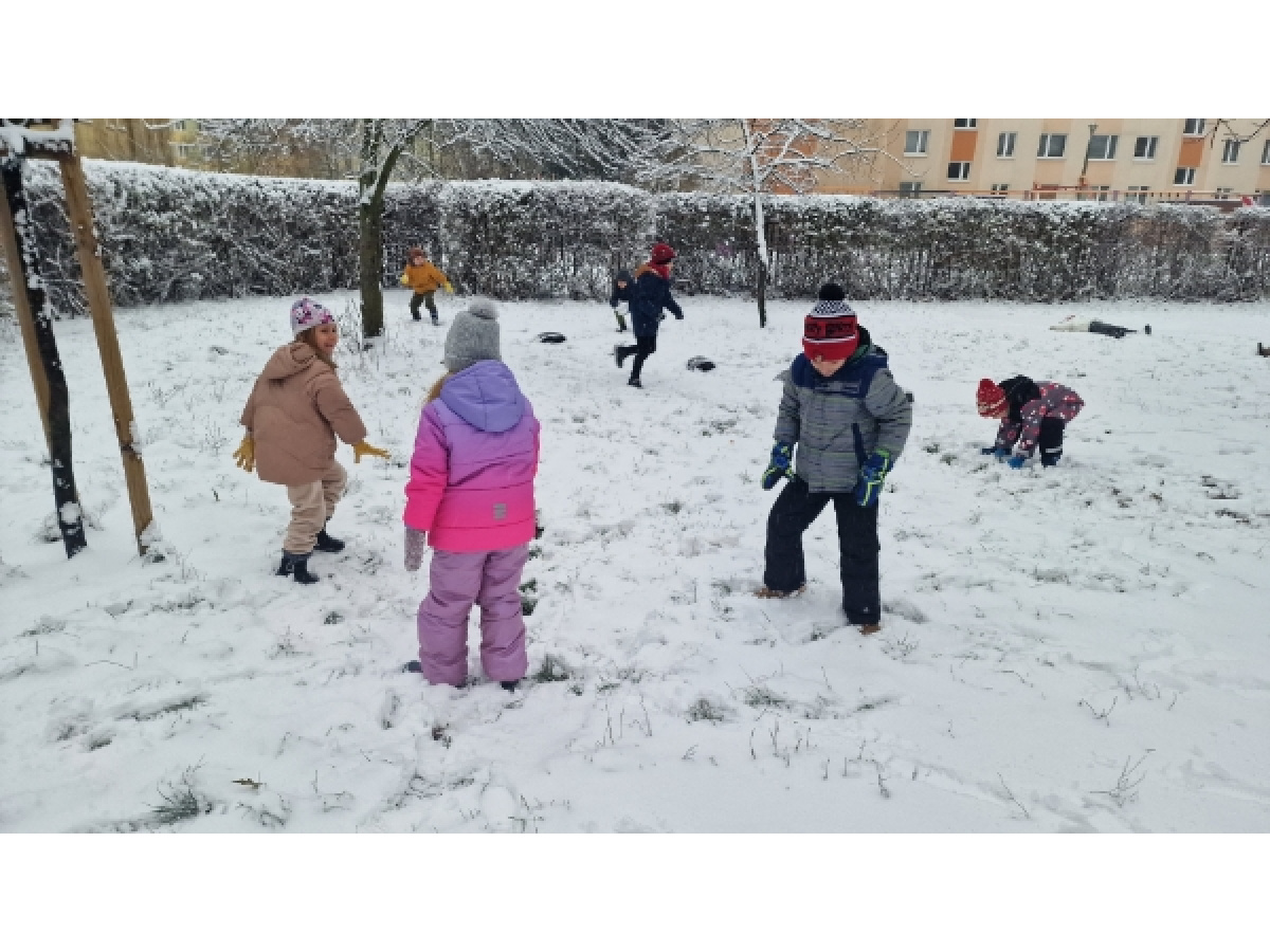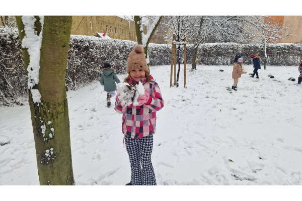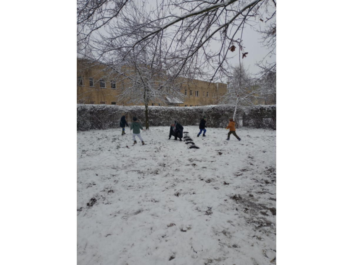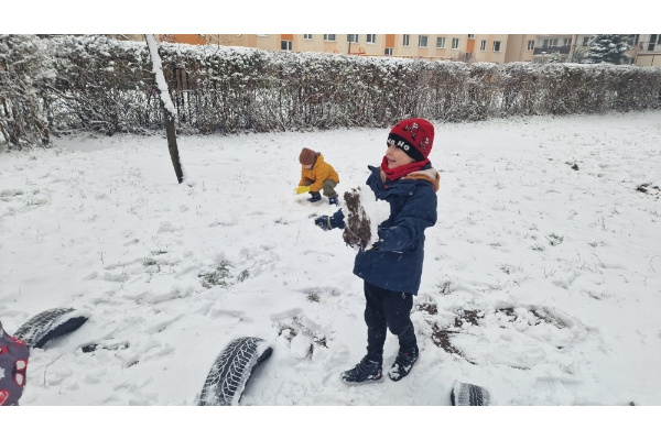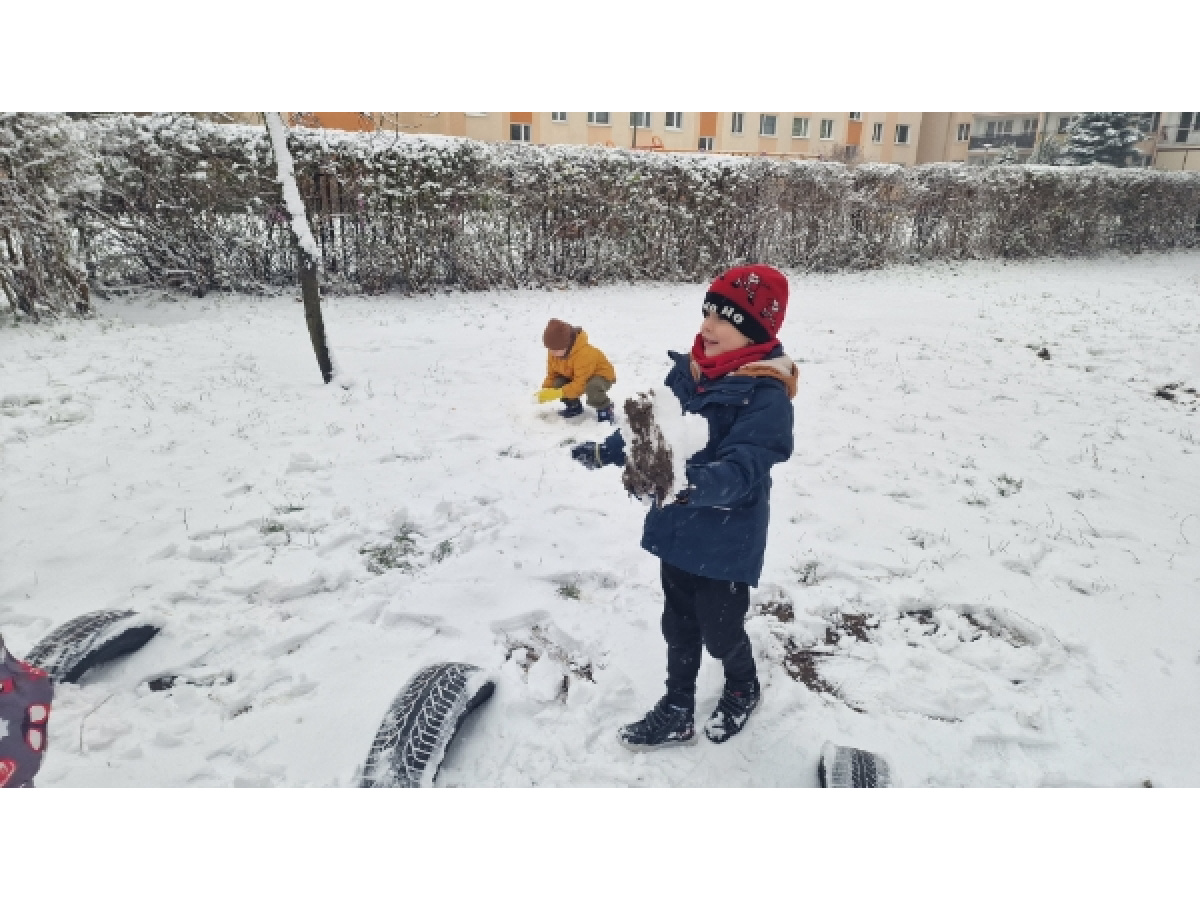 Gdy spadł pierwszy śnieg, nie pozostało nic innego jak iść się w nim pobawić! Były wielkie śnieżne kule, wspólne rzuty śnieżkami, a także biegi i skoki w sniegu. Zabawa była przednia!