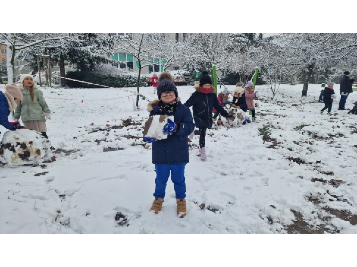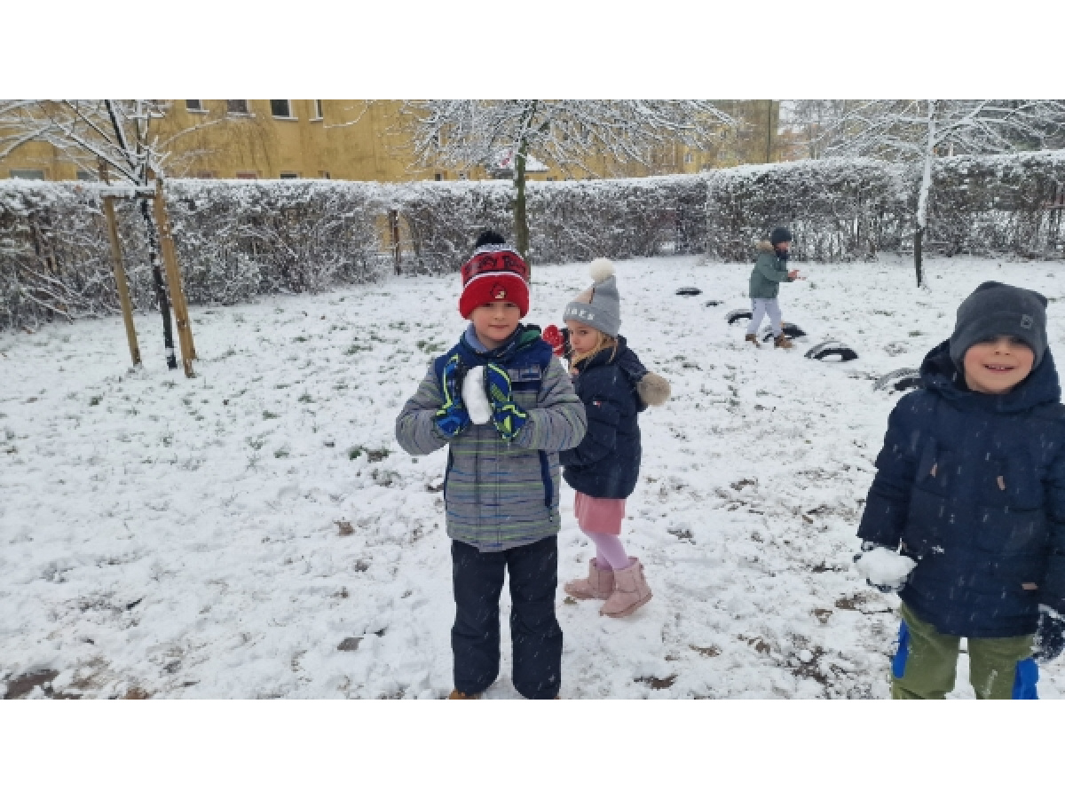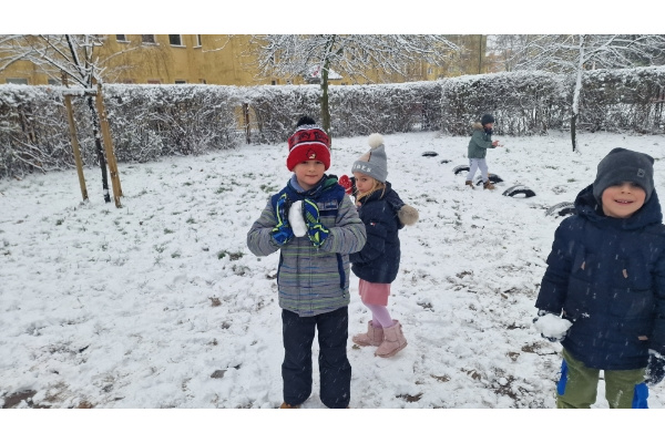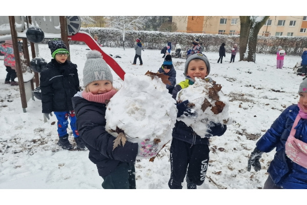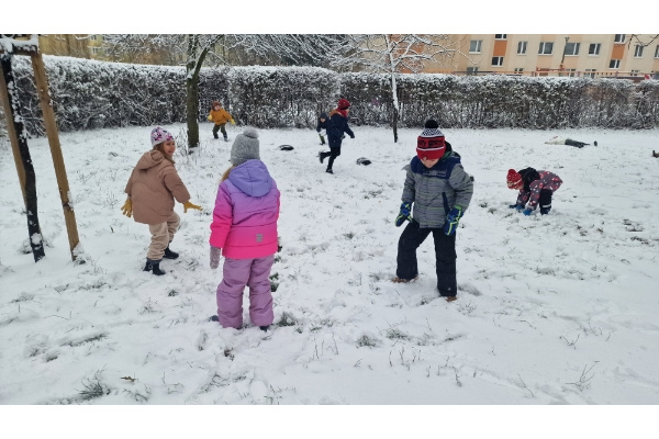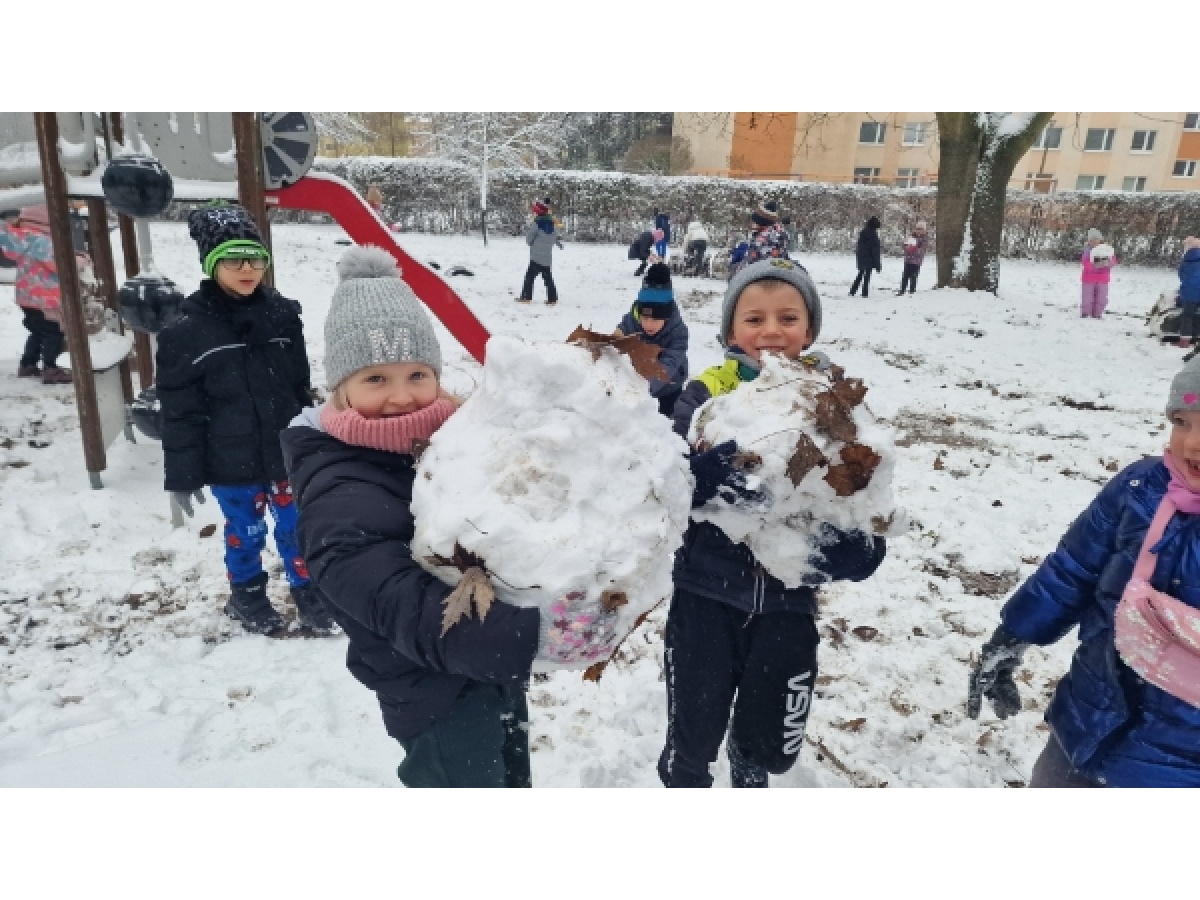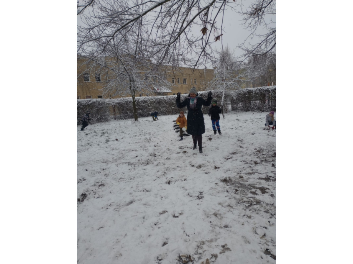 Gdy spadł pierwszy śnieg, nie pozostało nic innego jak iść się w nim pobawić! Były wielkie śnieżne kule, wspólne rzuty śnieżkami, a także biegi i skoki w sniegu. Zabawa była przednia!