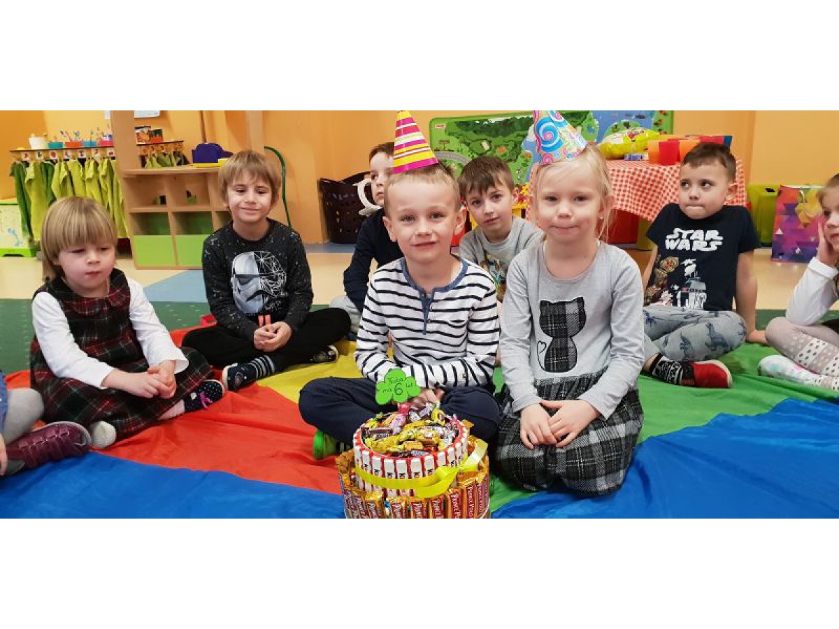 Nasze urodzinki styczniowe były wyjątkowe, zaskoczył nas oryginalny tort - zrobiony własnoręcznie przez mamę Kubusia. Tym razem nie rozkładaliśmy stołów, ale wykorzystaliśmy kolorową chustę i balony do zabawy. Solenizanci świetnie się bawili i przedszkolaki też.