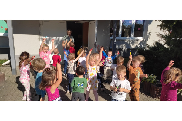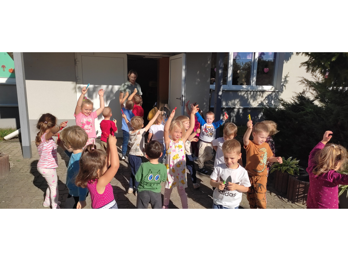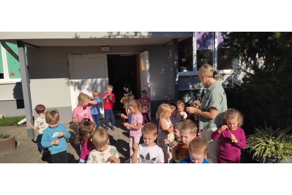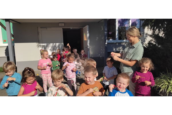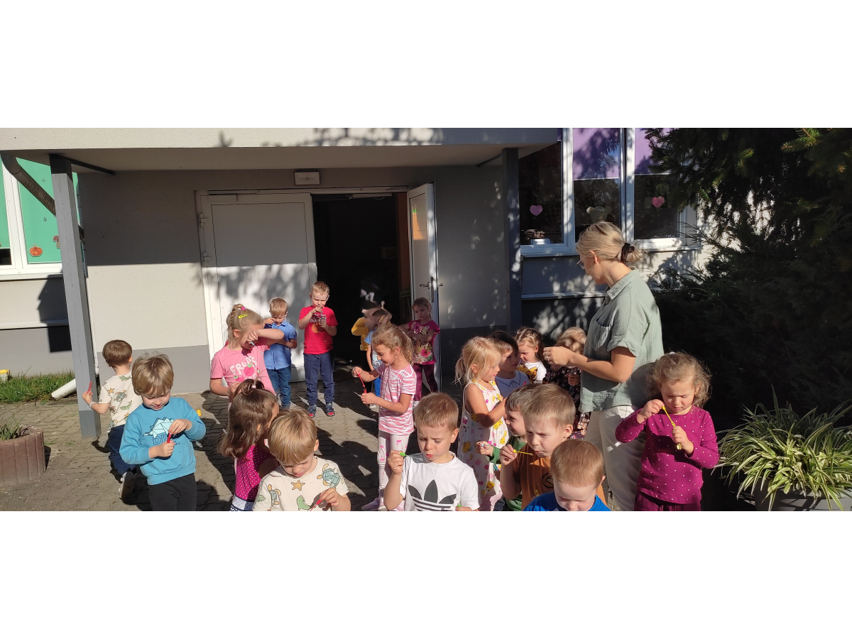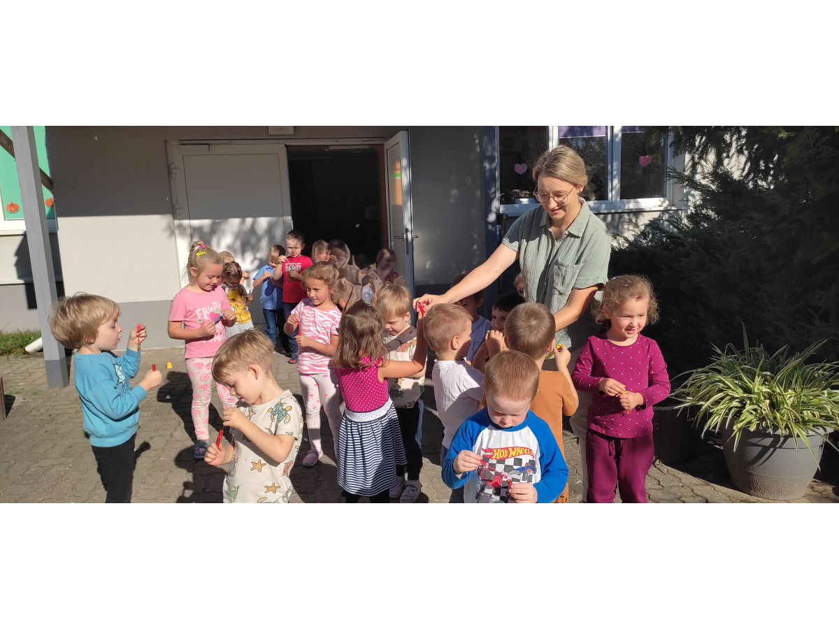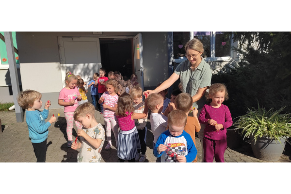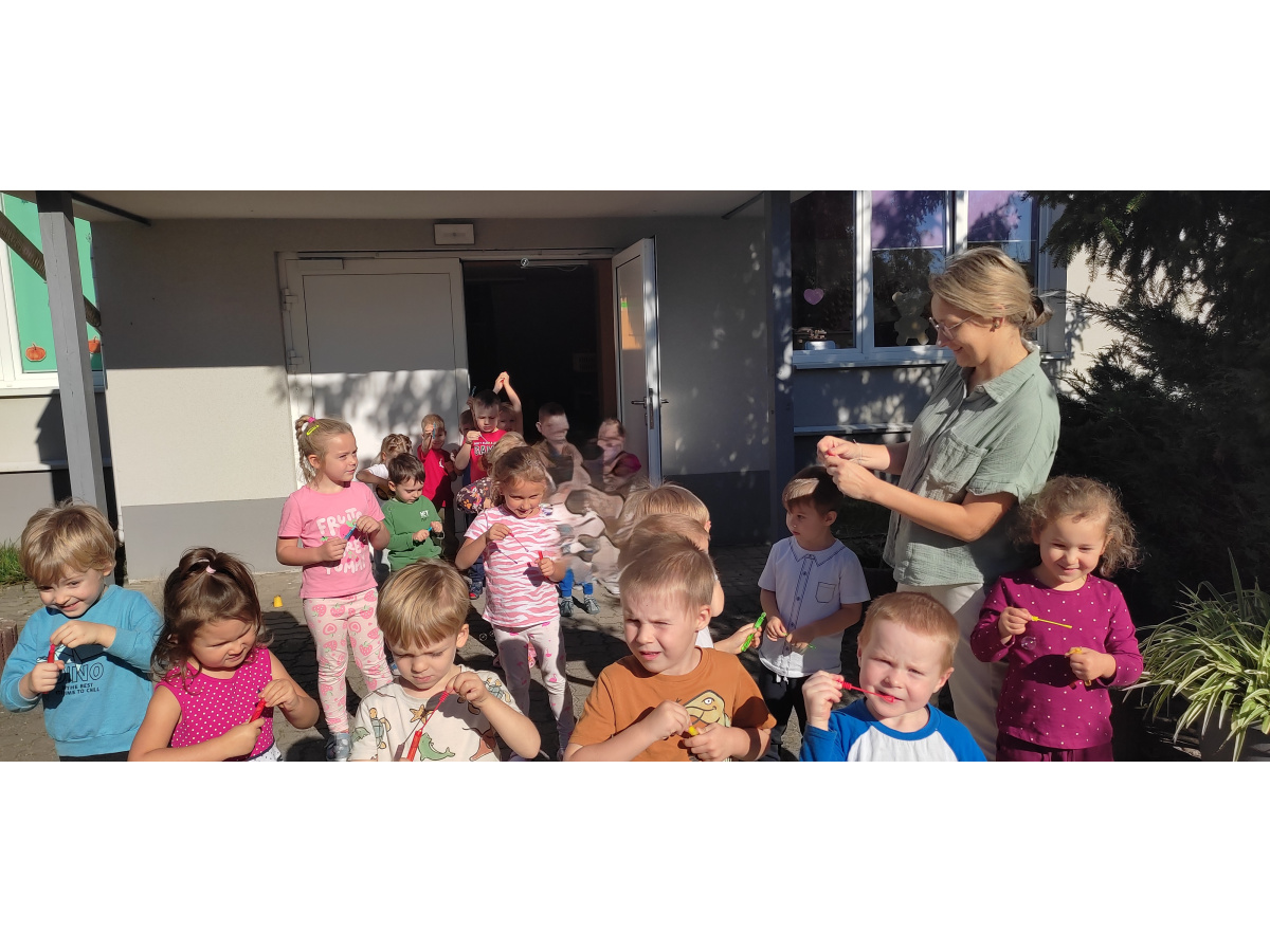 Dzieci w grupie „Liski” bardzo lubią słuchać bajek. A już wielką radość sprawiła im pani Kasia, która przyszła odwiedzić swoich podopiecznych i przeczytała im opowiadanie. Podarowała im bańki mydlane, które trzeba było zaraz wypróbować :)