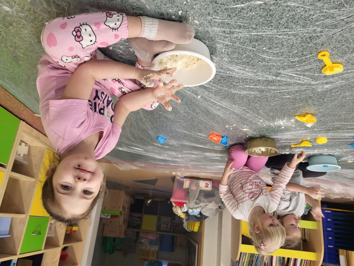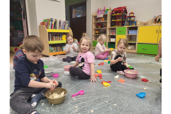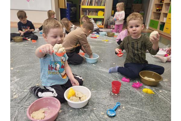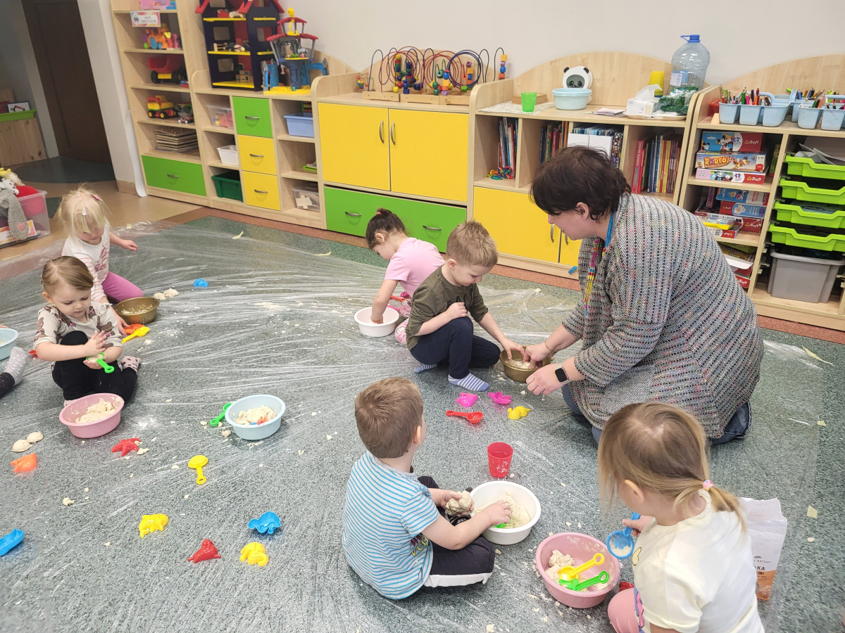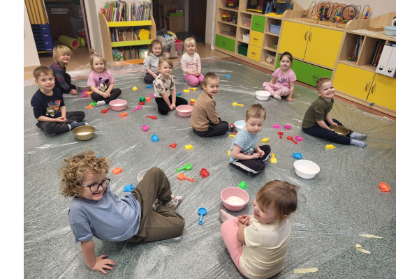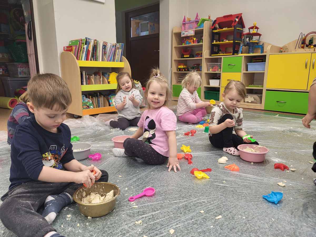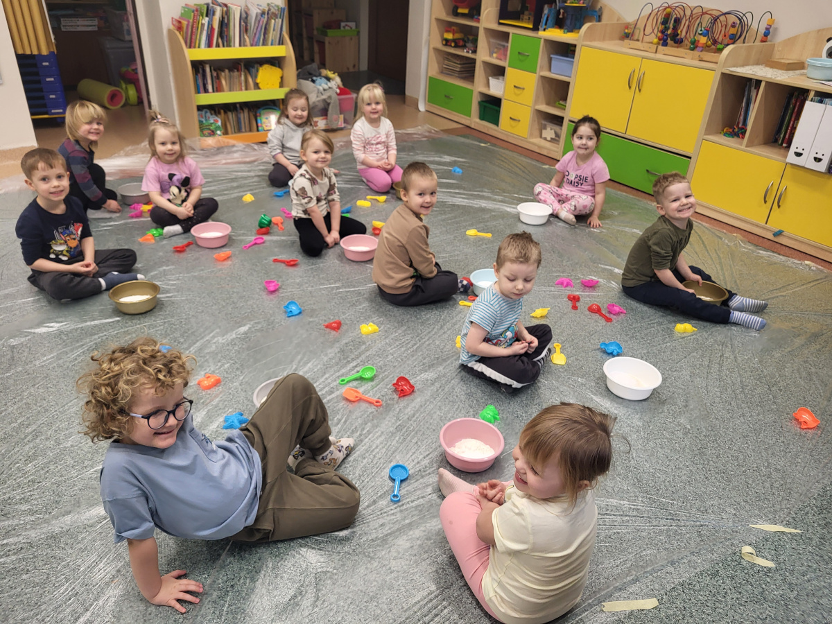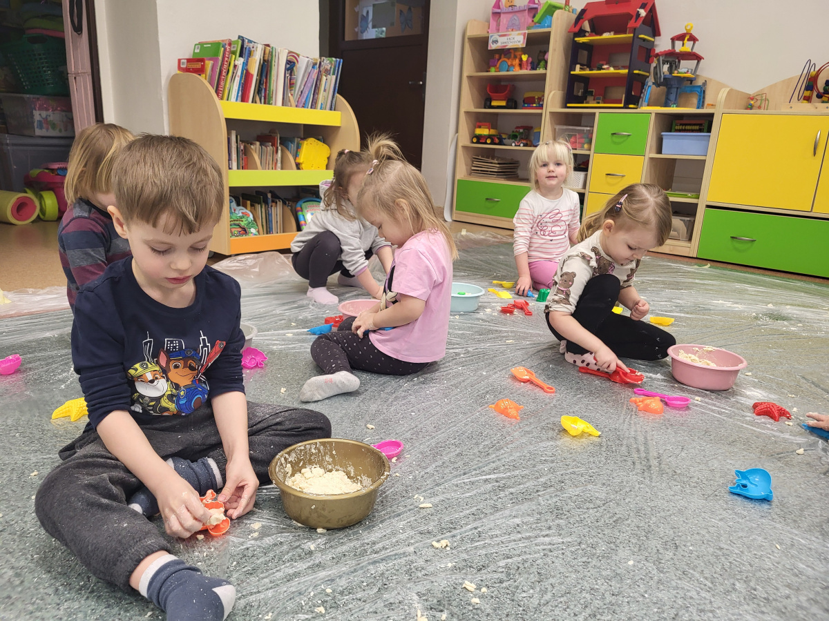 Dzieci z grupy „Motylki” uczestniczyły w zajęciach sensorycznych z wykorzystaniem masy solnej. Przedszkolaki ugniatały, przesypywały i tworzyły różne formy, korzystając z misek, łopatek i foremek. Były to zajęcia pełne radości, które rozwijały zmysły, kreatywność oraz sprawność dłoni.