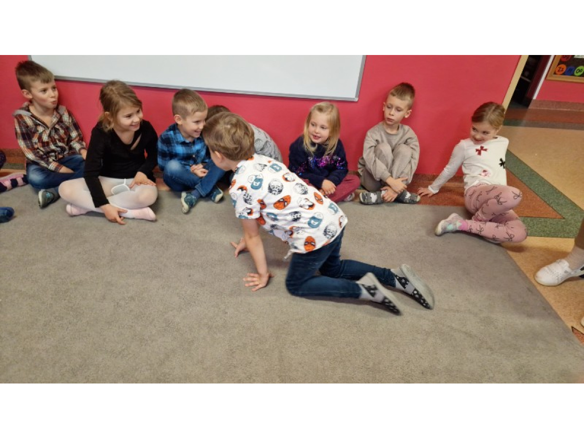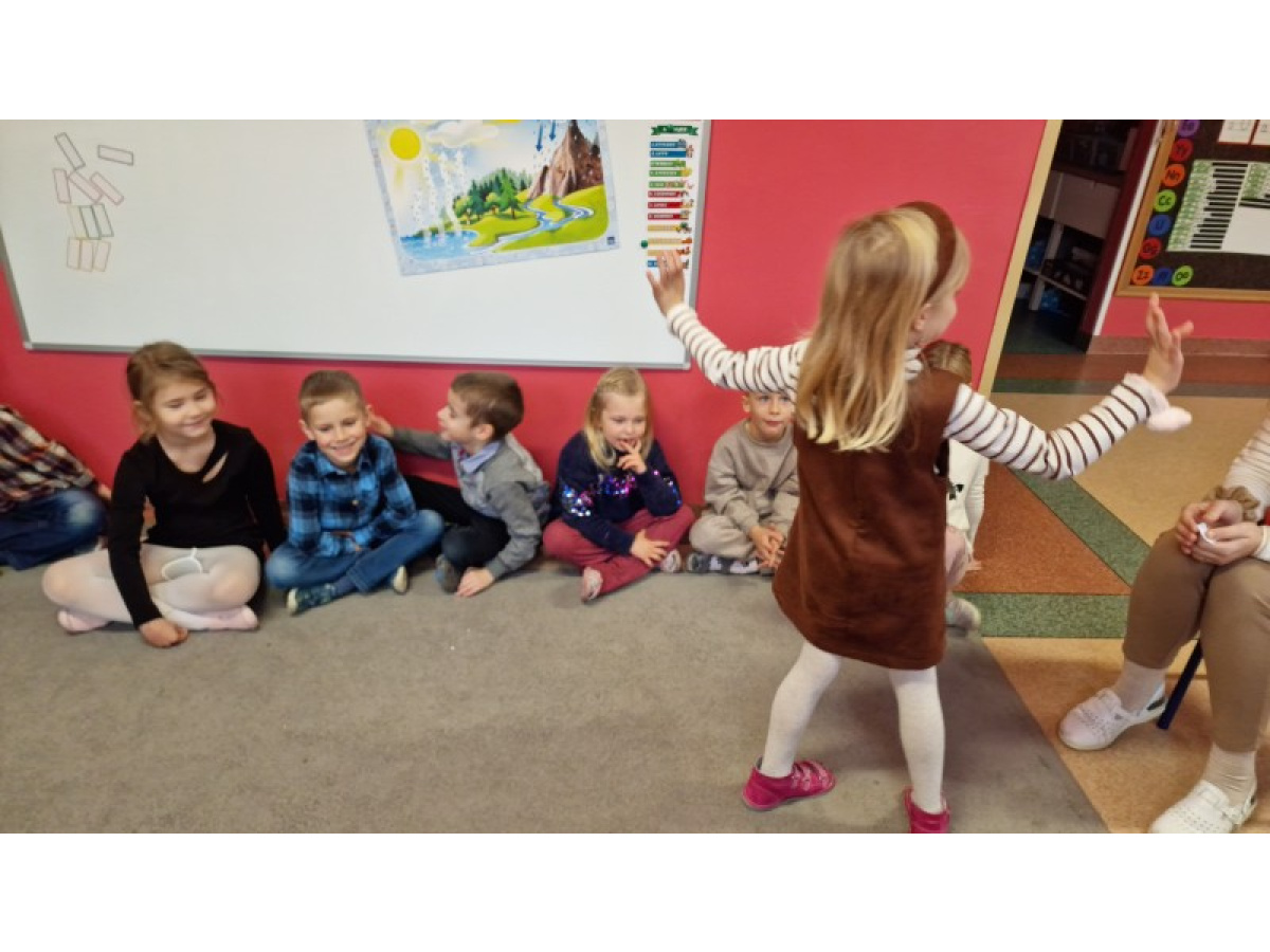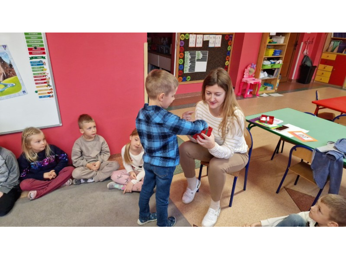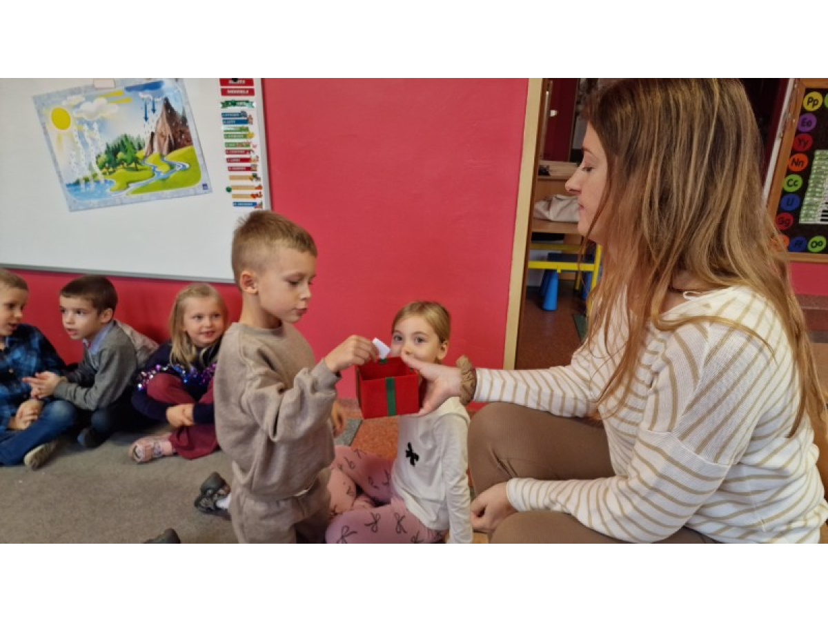 Pani psycholog w naszej grupie prowadzi co 2 tygodnie, zajęcia z innowacji o emocjach. Nie zabrakło ustalenia zasad panujących podczas zajęć, a potem przyszedł czas na losowanie zadania z prezentu i wykonywanie go. Dziecieom to zadanie przyniosło wiele radości i nauczyło lepiej rozumieć emocję.