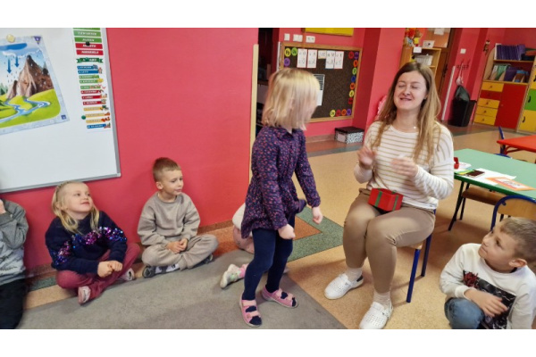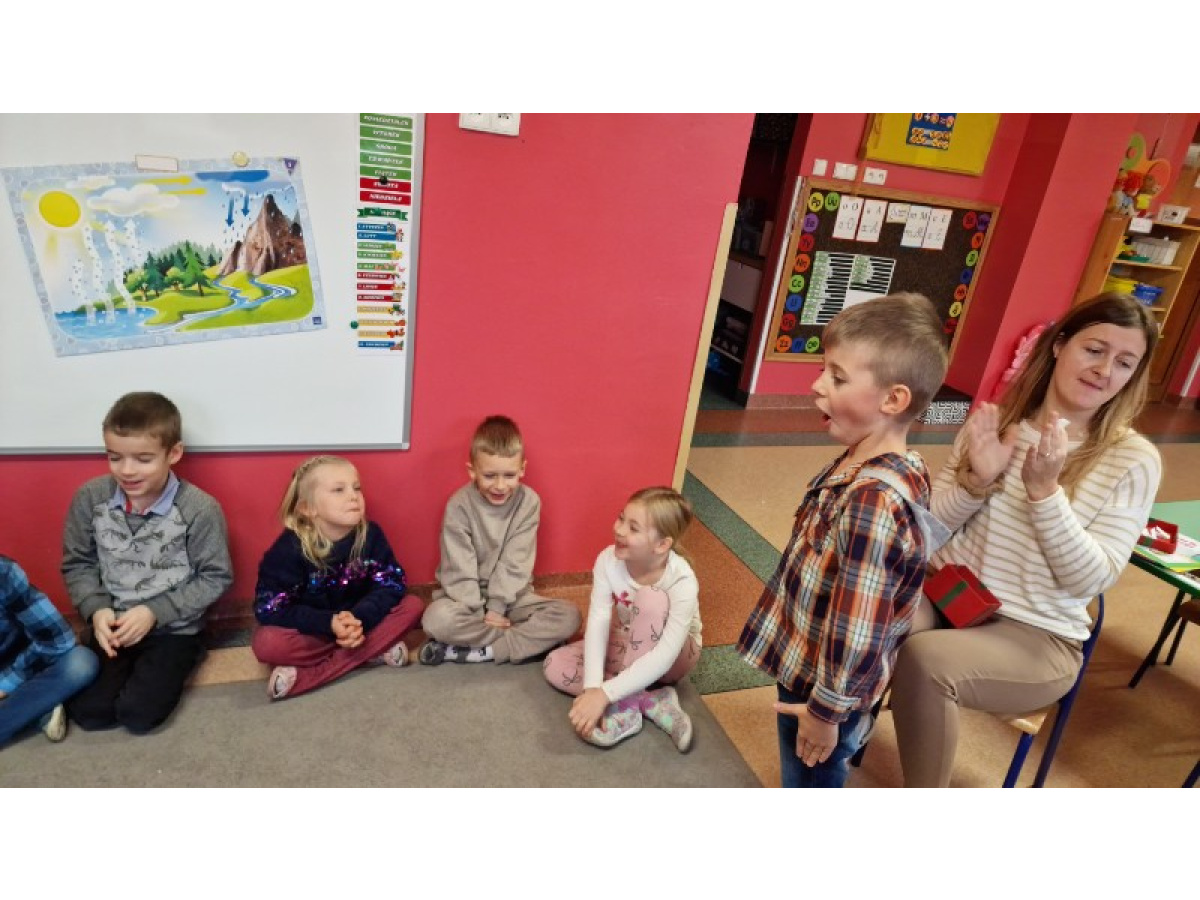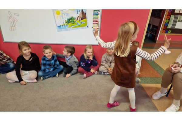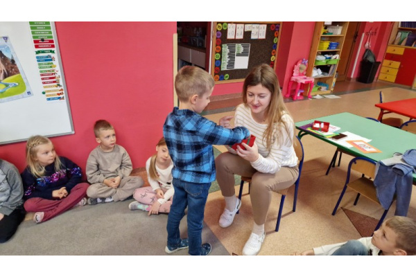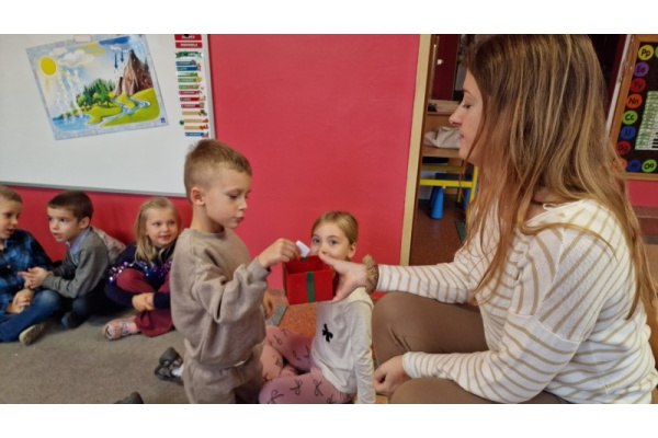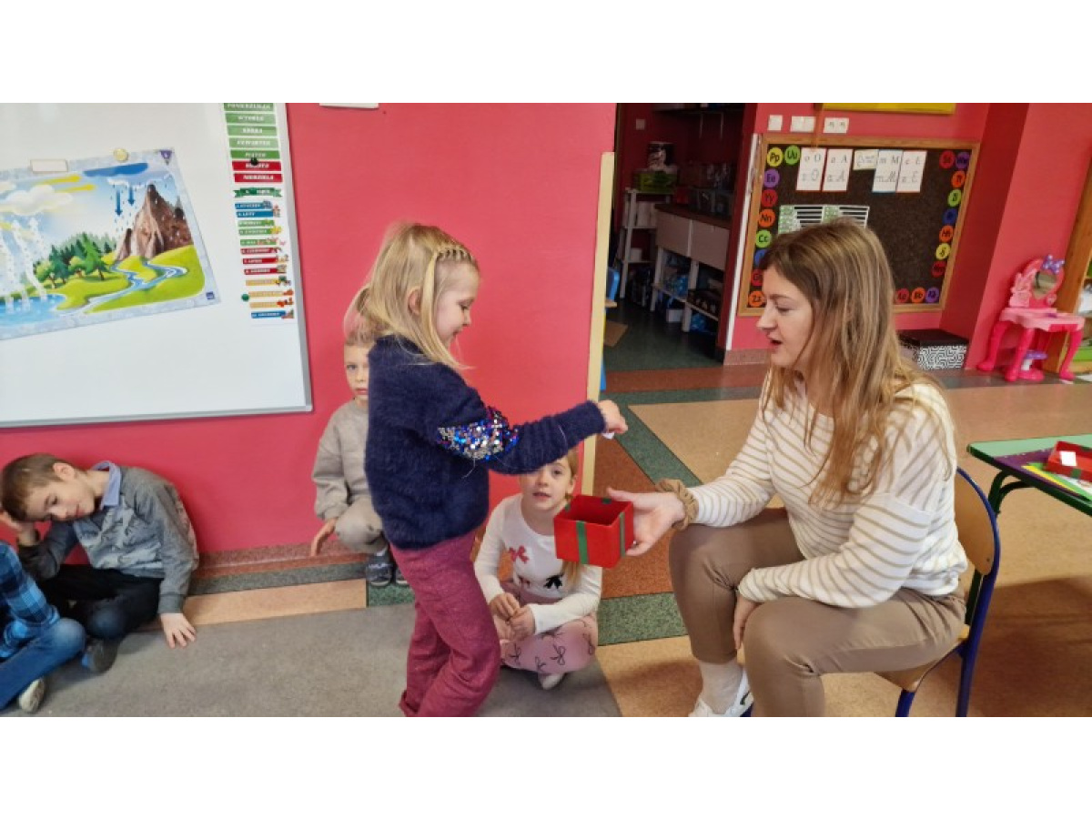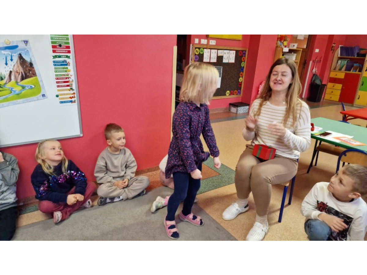 Pani psycholog w naszej grupie prowadzi co 2 tygodnie, zajęcia z innowacji o emocjach. Nie zabrakło ustalenia zasad panujących podczas zajęć, a potem przyszedł czas na losowanie zadania z prezentu i wykonywanie go. Dziecieom to zadanie przyniosło wiele radości i nauczyło lepiej rozumieć emocję.