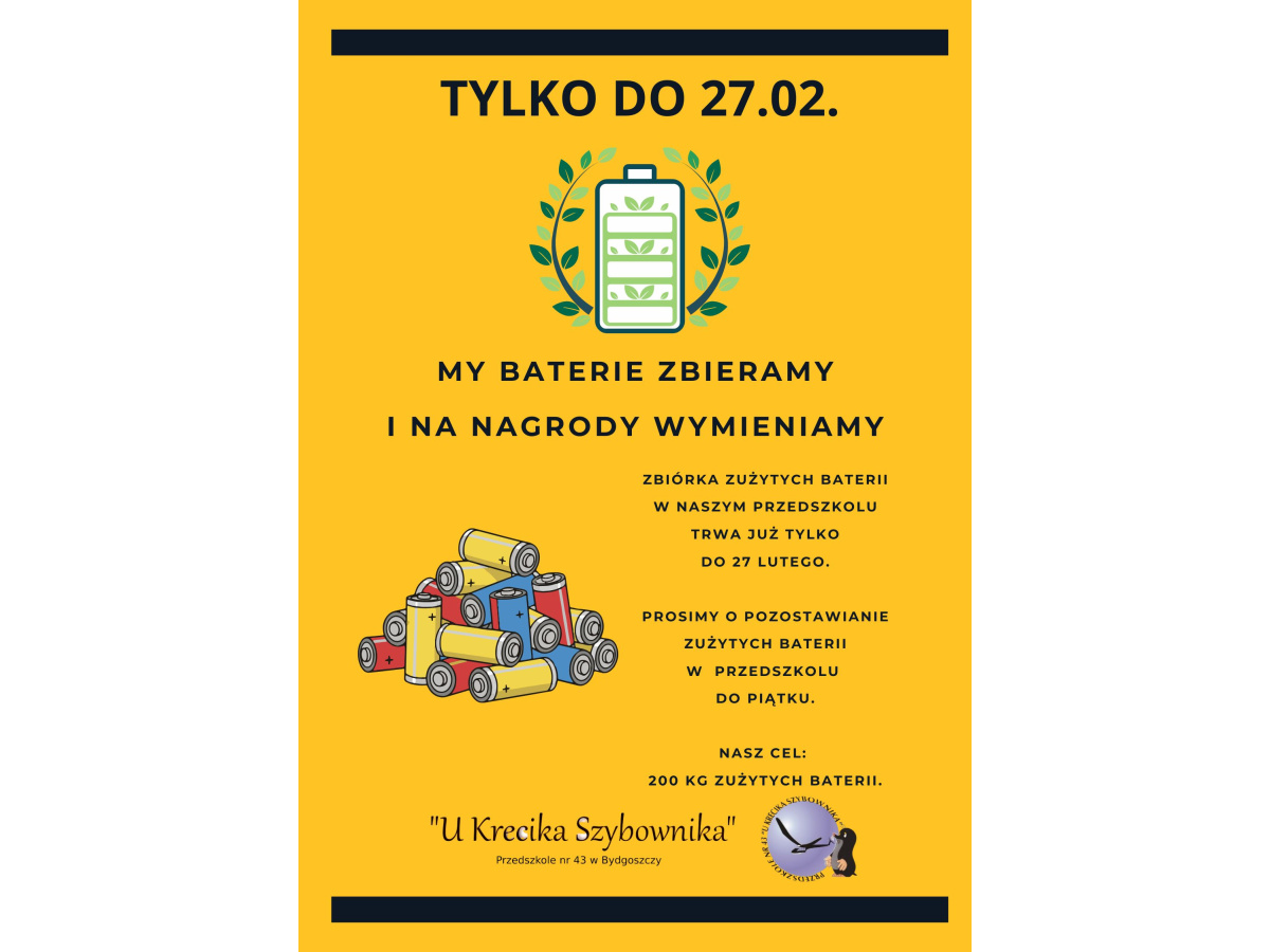 Już tylko do 27 lutego można przynosić baterie do naszego przedszkola. Naszym celem jest osiągnięcie wagi 200kg zużytych baterii. Państwa zaangażowanie realnie przekłada się na zakup nowego wyposażenia do przedszkola. Wspólnymi siłami, jeszcze w tym roku szkolnym możemy wzbogacić nasze przedszkole o kolejne, bardzo wartościowe pomoce dydaktyczne.