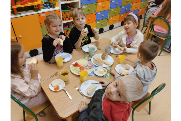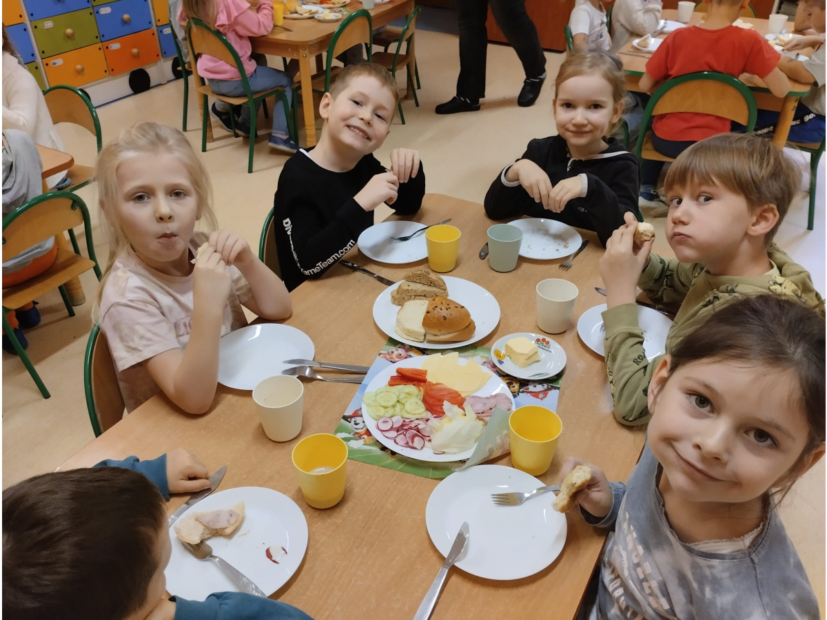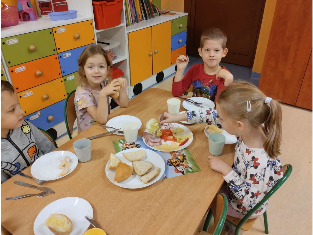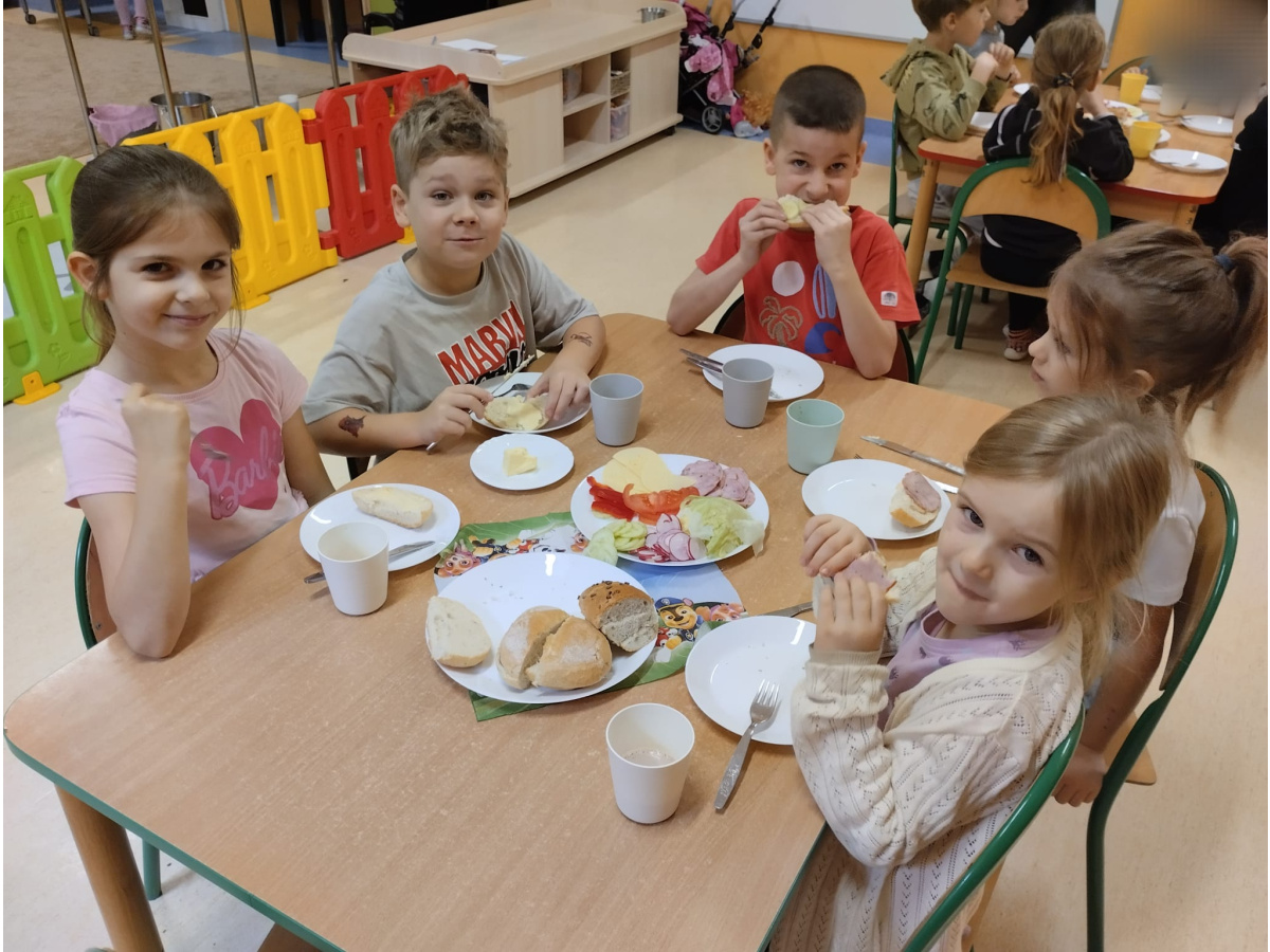 5. listopada, kolejny już raz dzieci miały okazję samodzielnie przygotować śniadanie. Z apetytem zjadły kanapki z szynką, serem i wybranymi przez siebie warzywami. Doskonaliły umiejętność posługiwania się nożem w bezpieczny sposób i dokonywania samodzielnych decyzji. Dzieci poznawały także walory odżywcze wybranych produktów oraz ich wpływu na zdrowie.