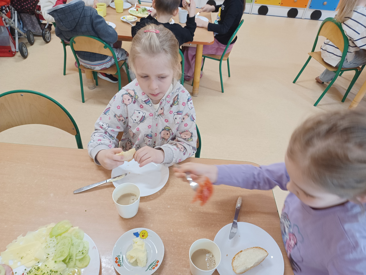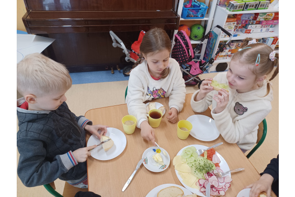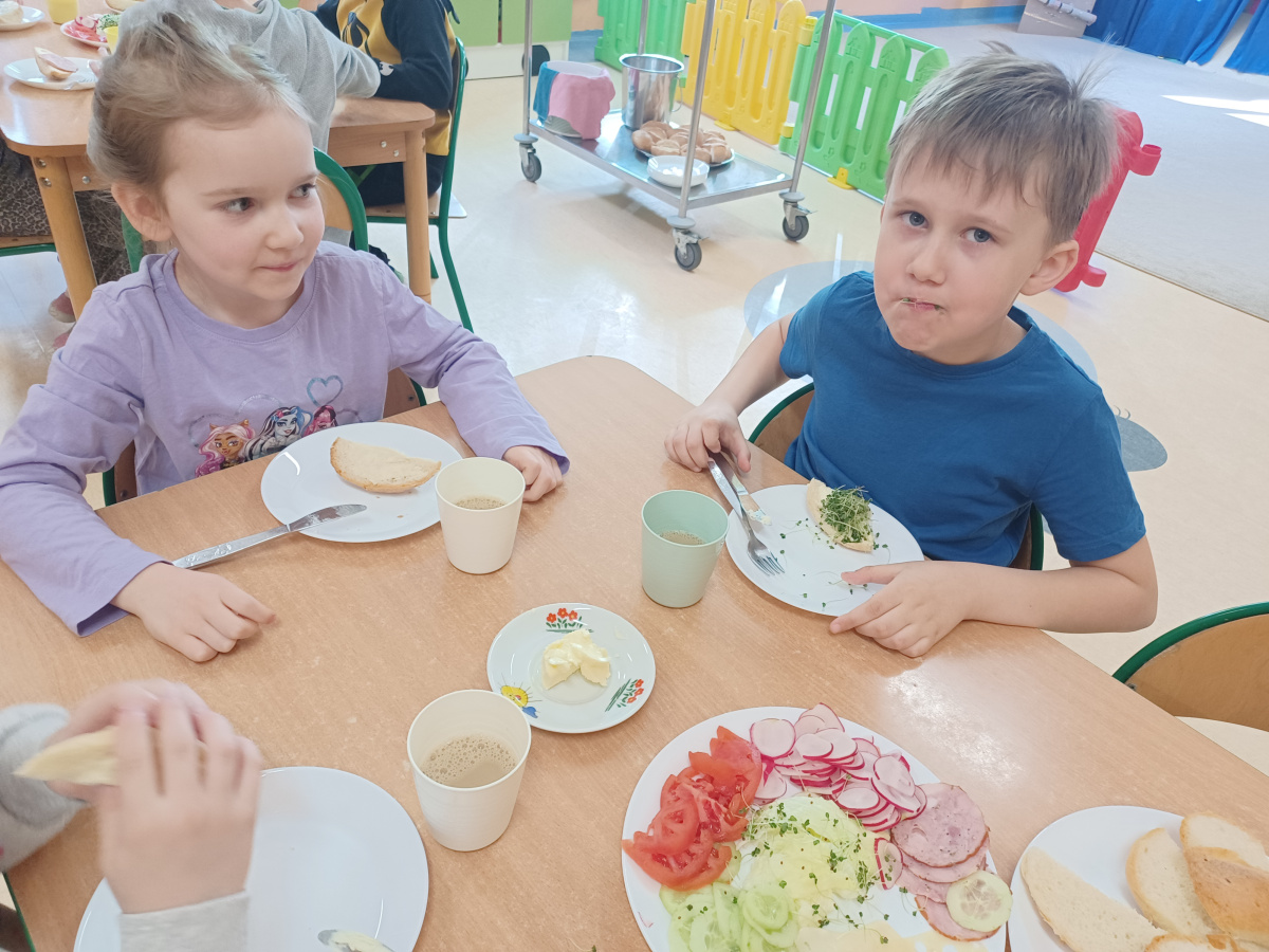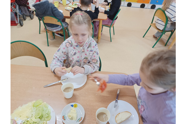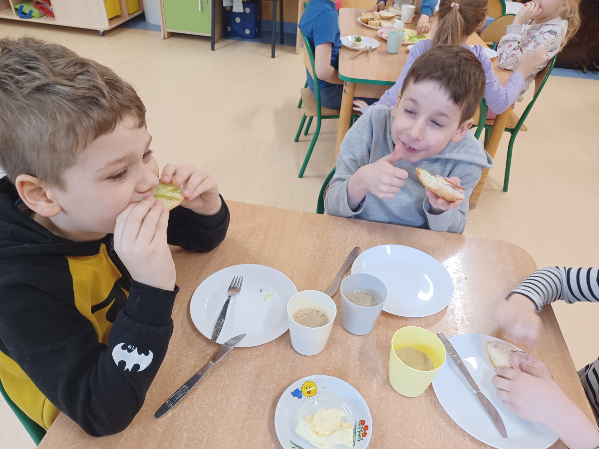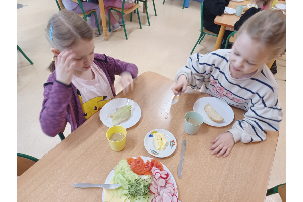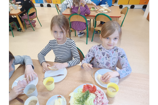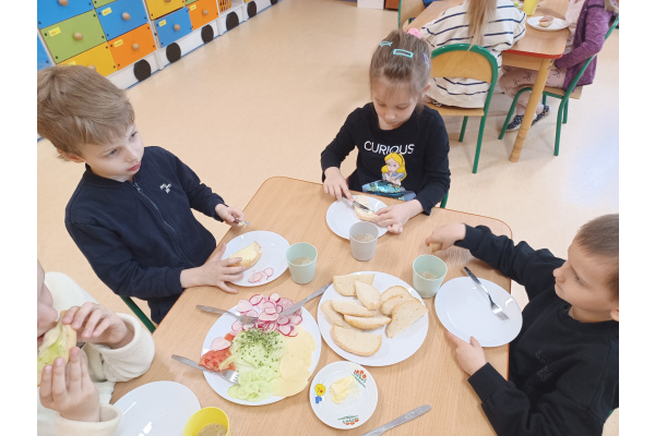 Na początku każdego miesiąca w naszym przedszkolu mamy śniadanie, które dzieci przygotowują sobie same. Żabki uwielbiają takie śniadanka i kolorowe, pyszne kanapki!