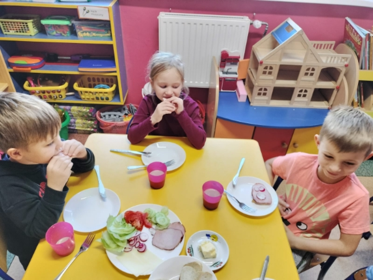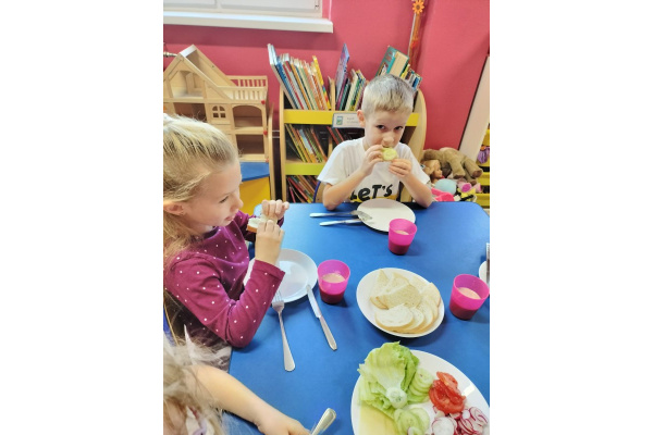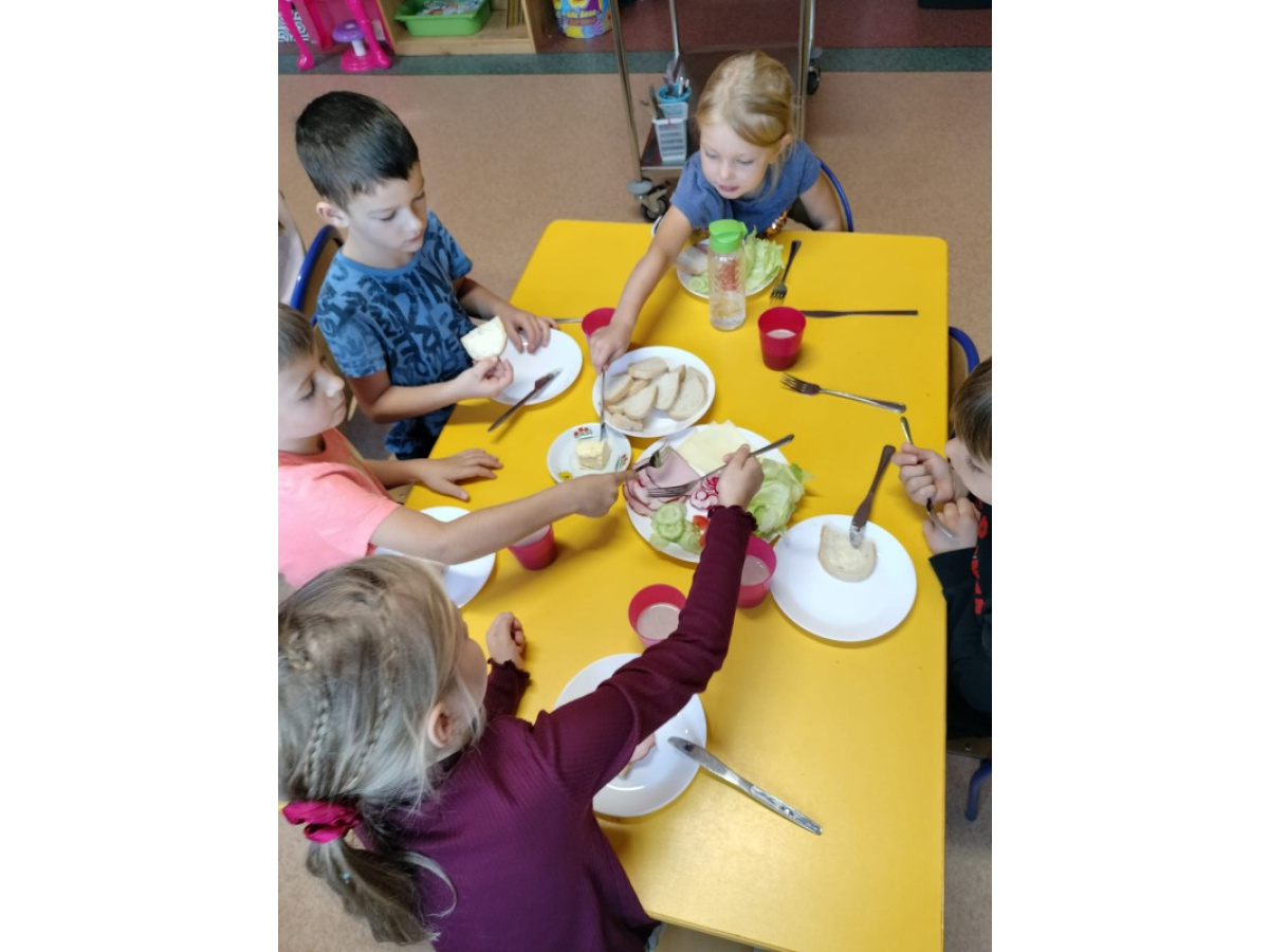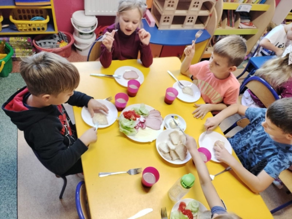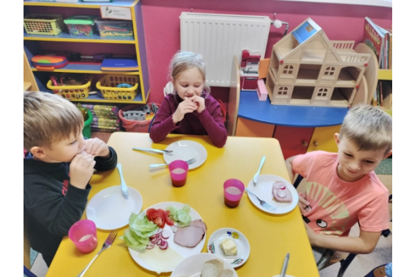 Podczas wspólnego posiłku dzieci uczyły się zasad kulturalnego zachowania przy stole oraz odkrywały, że zdrowe jedzenie może być smaczne i ciekawe.