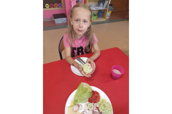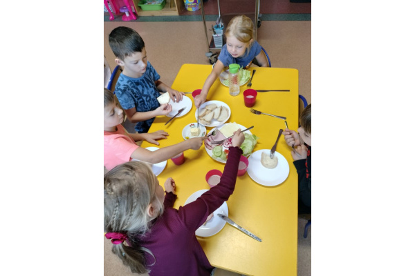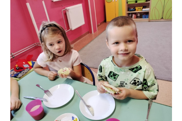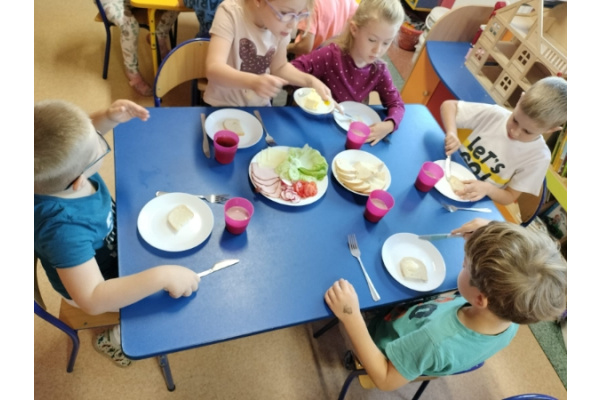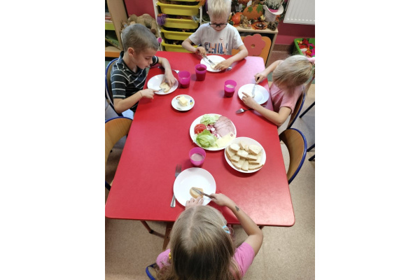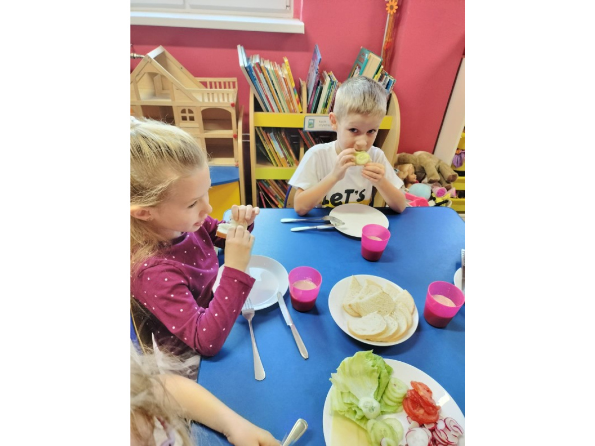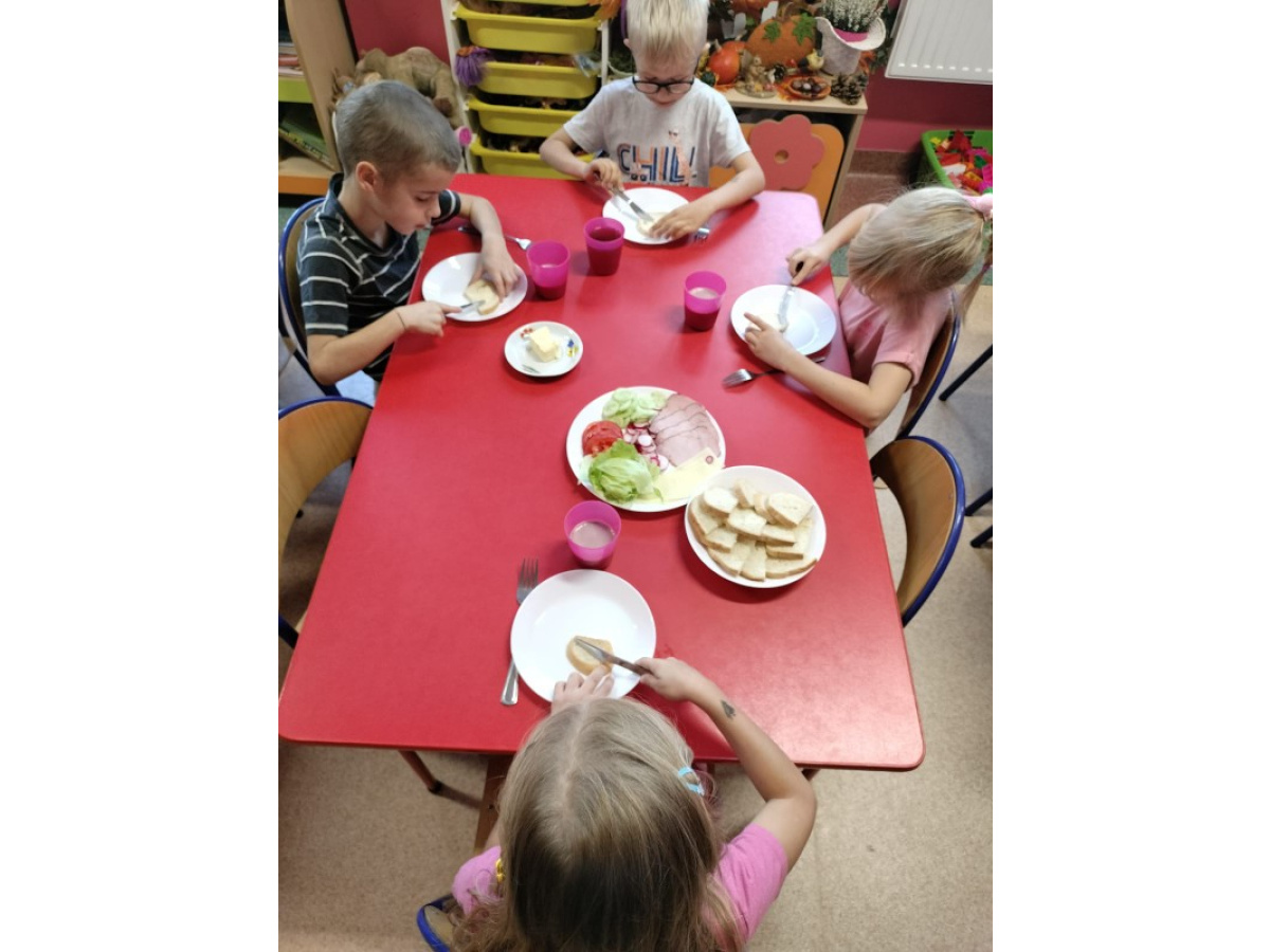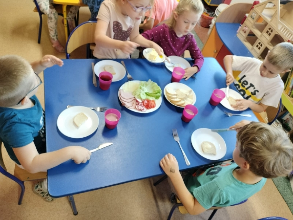 Podczas wspólnego posiłku dzieci uczyły się zasad kulturalnego zachowania przy stole oraz odkrywały, że zdrowe jedzenie może być smaczne i ciekawe.