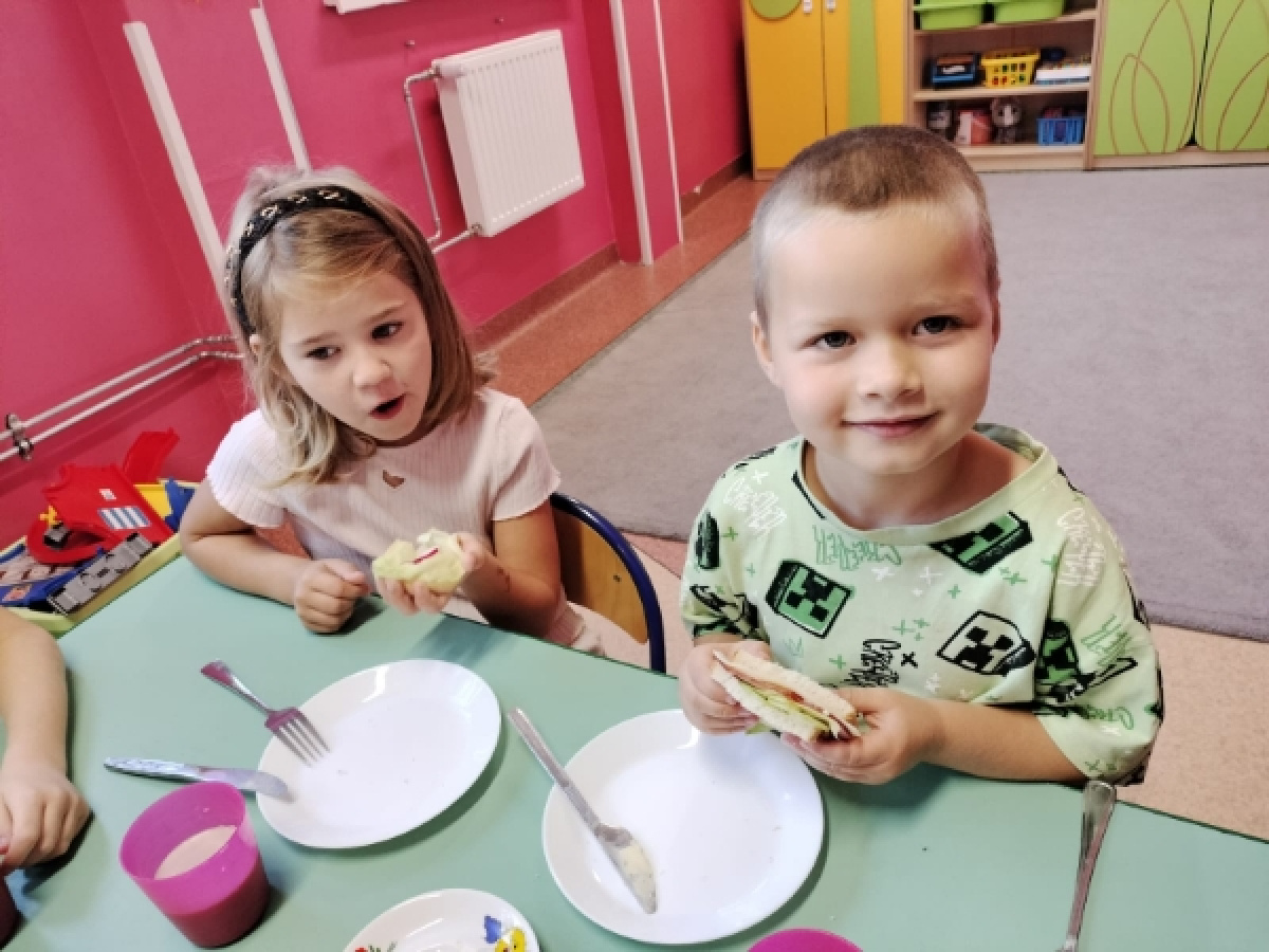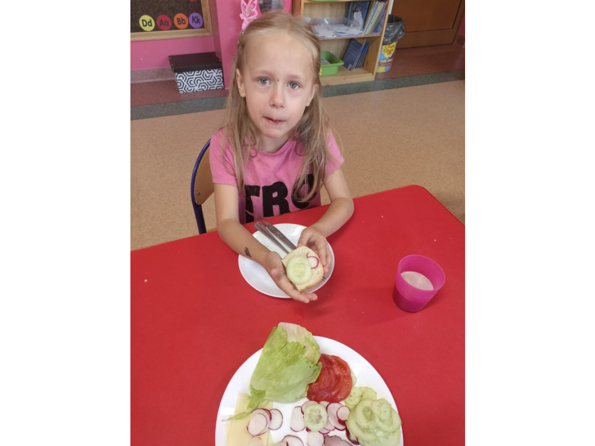 Dzieci rozpoczęły dzień od rozmowy na temat wartości odżywczych produktów i roli witamin w codziennej diecie. Następnie przedszkolaki samodzielnie przygotowywały kolorowe, zdrowe kanapki z pełnoziarnistego pieczywa, warzyw, serów i chudych wędlin.