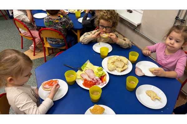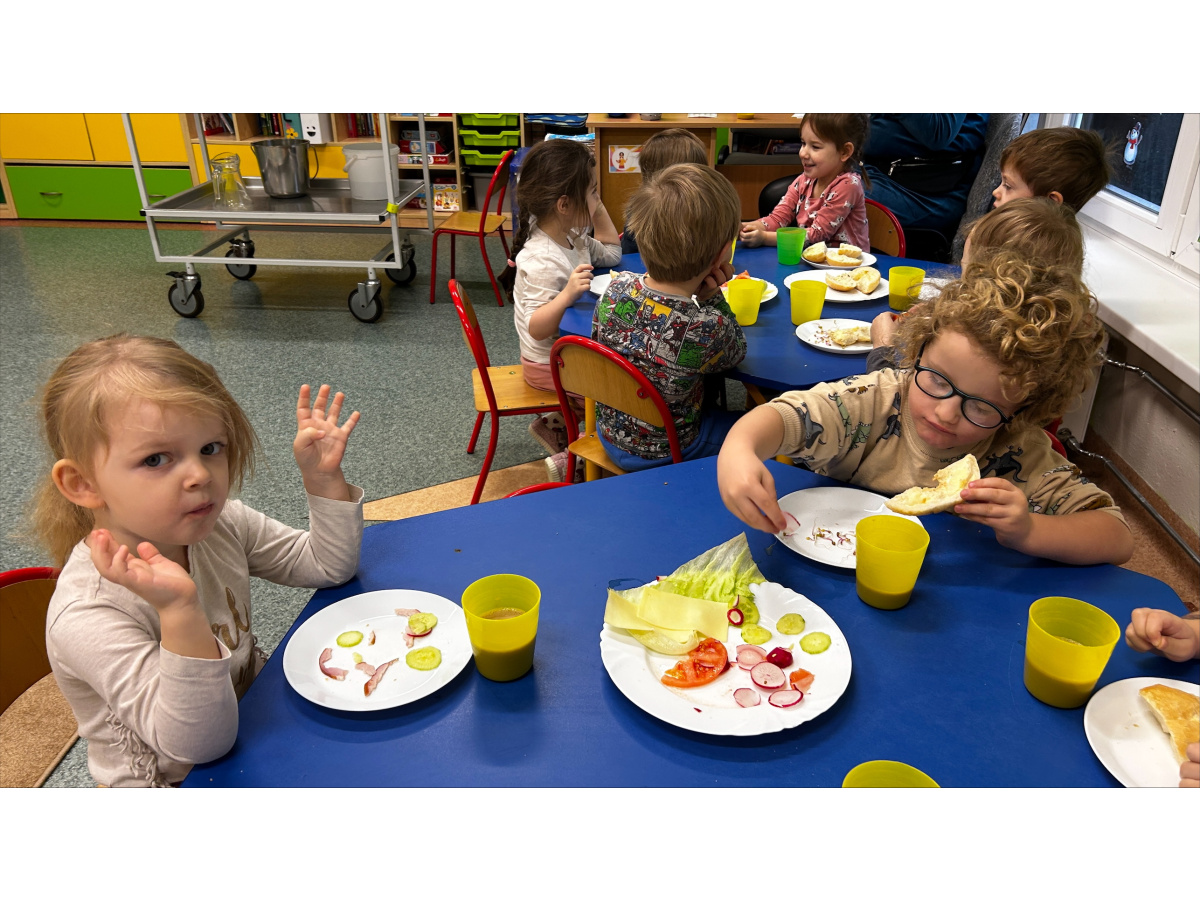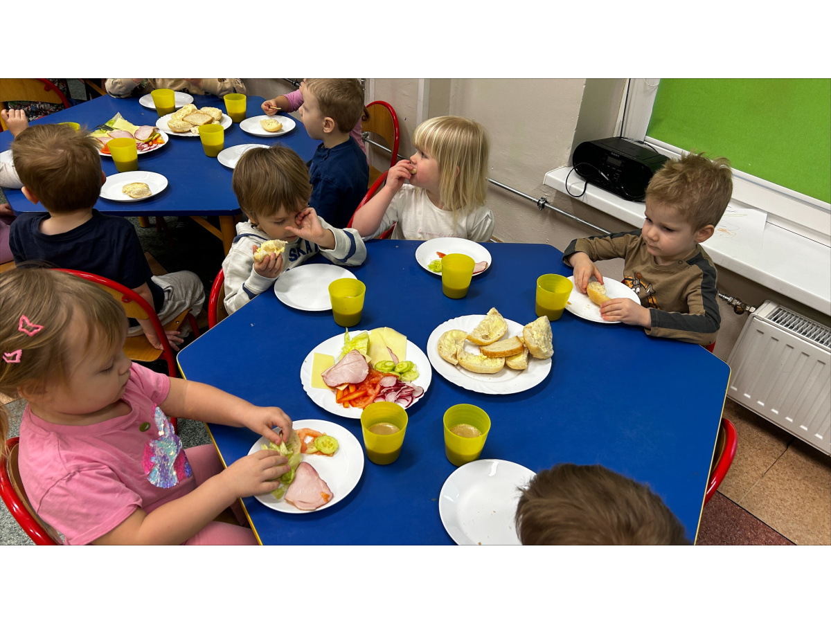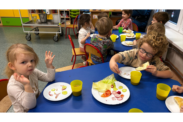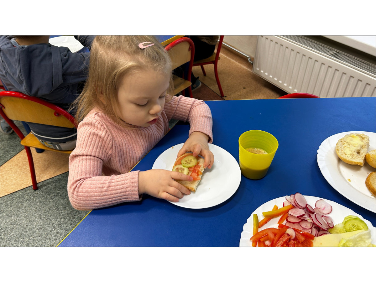 „Motylki” bardzo lubią zdrowe śniadania, co widać na załączonych zdjęciach. Tego dnia przedszkolaki miały okazję spróbować kiełków brokuła- dla wielu z nich był to nowy smak. Podczas wspólnych posiłków dzieci poznają nazwy warzyw, uczą się zdrowych nawyków żywieniowych i z radością odkrywają, co znajduje się na ich talerzach.
