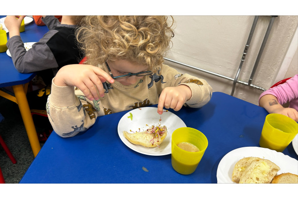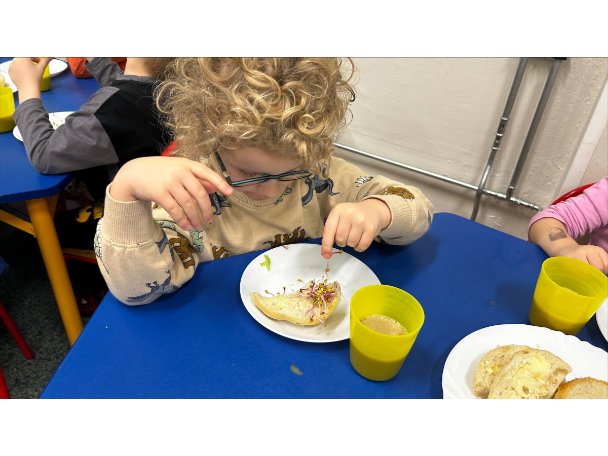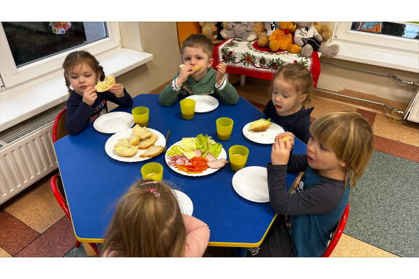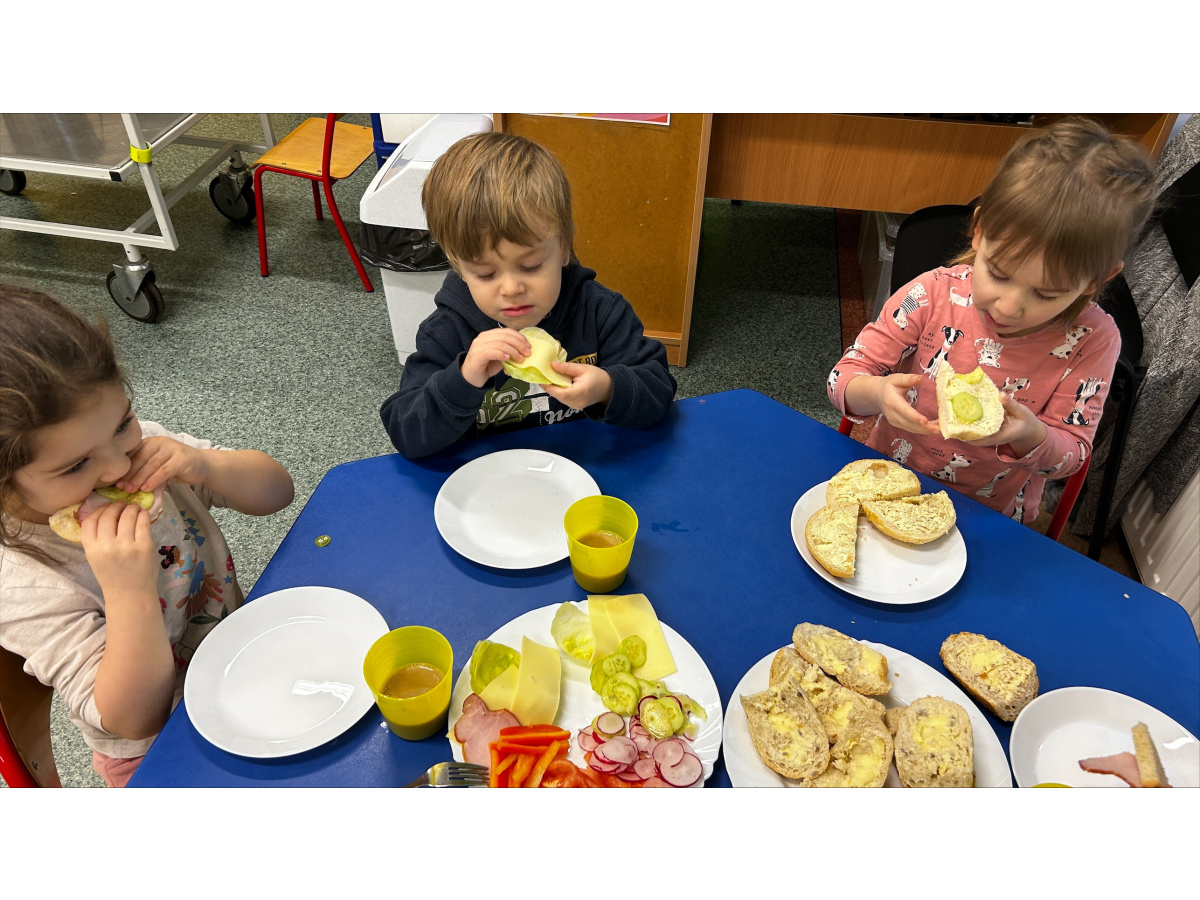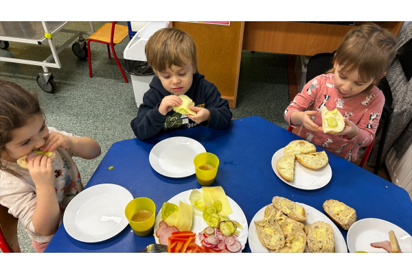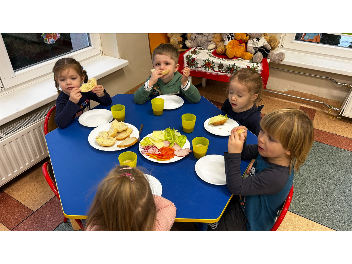 „Motylki” bardzo lubią zdrowe śniadania, co widać na załączonych zdjęciach. Tego dnia przedszkolaki miały okazję spróbować kiełków brokuła- dla wielu z nich był to nowy smak. Podczas wspólnych posiłków dzieci poznają nazwy warzyw, uczą się zdrowych nawyków żywieniowych i z radością odkrywają, co znajduje się na ich talerzach.