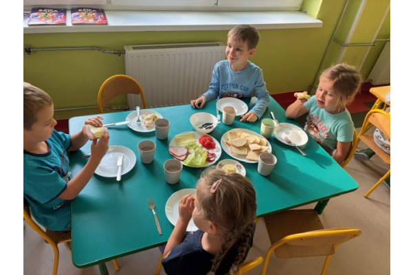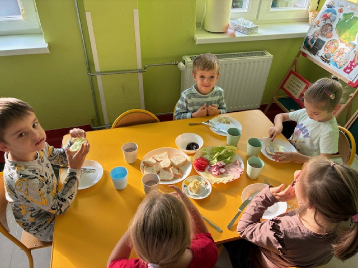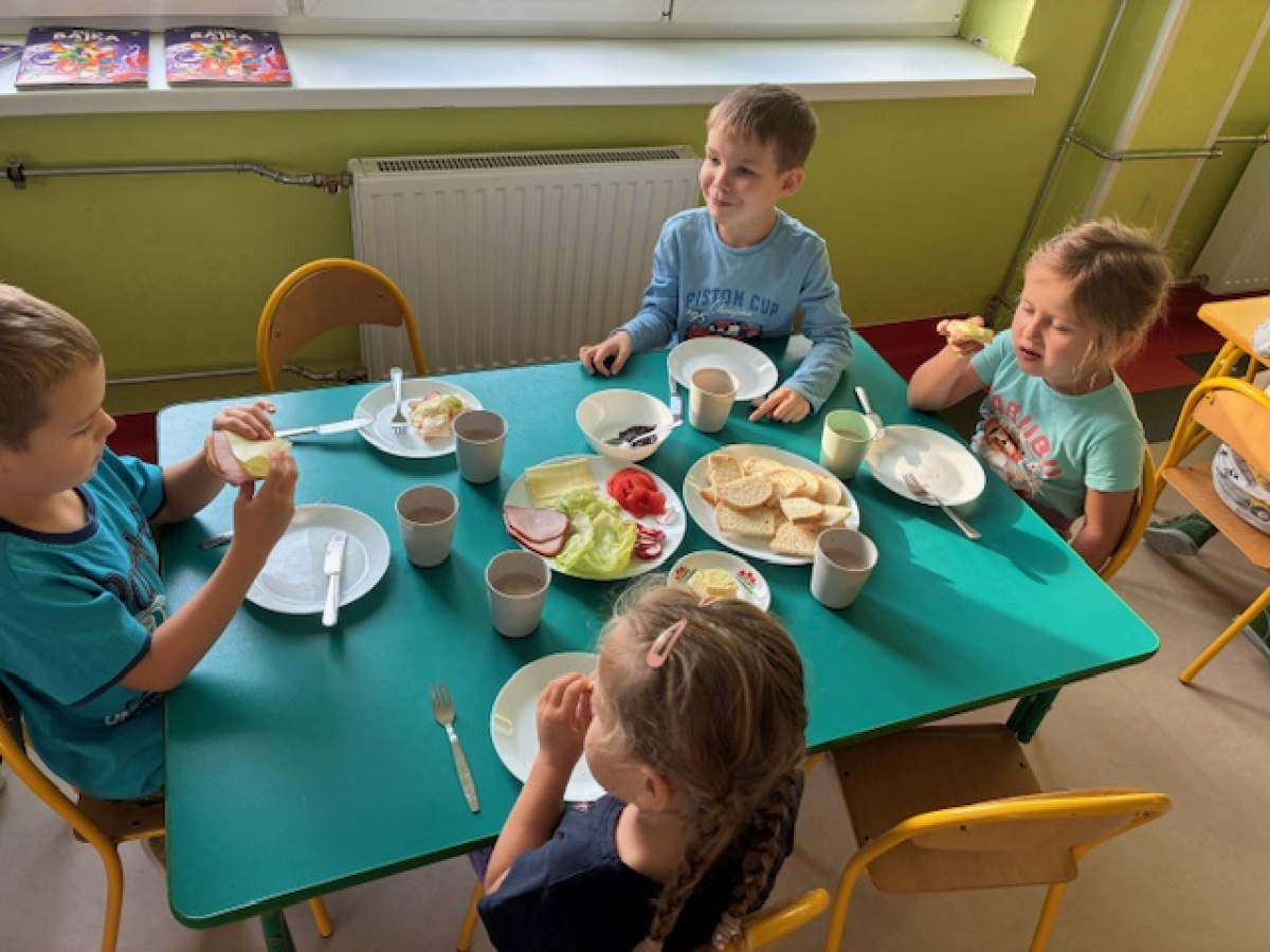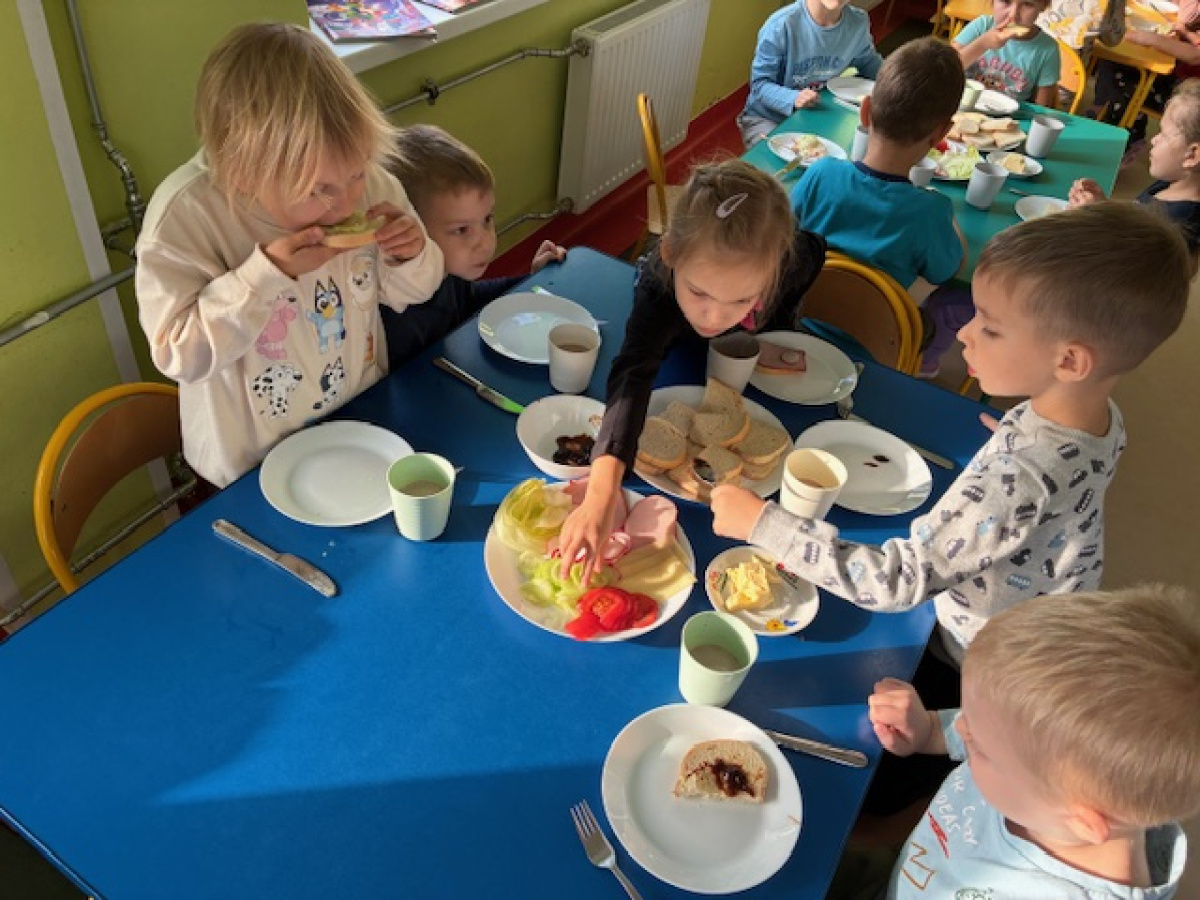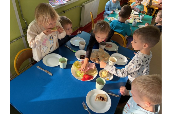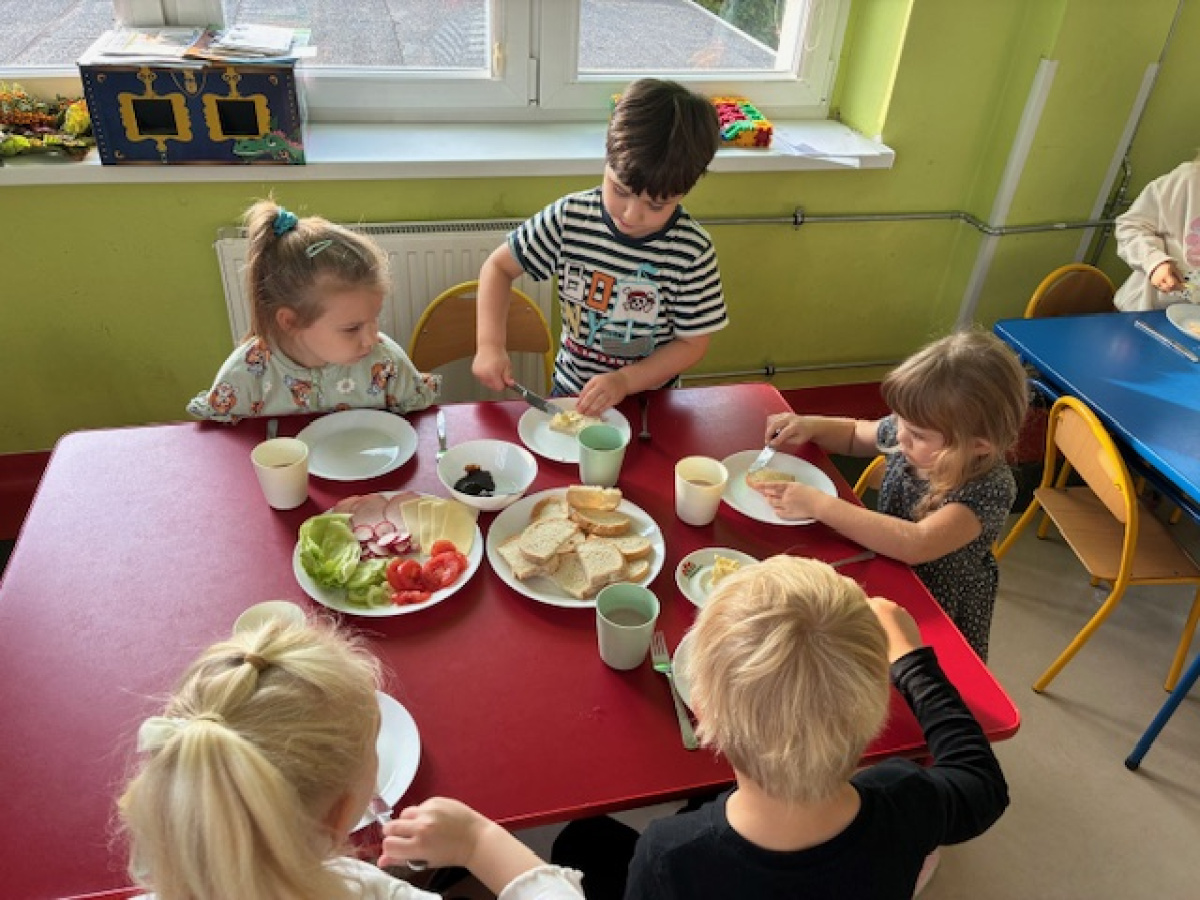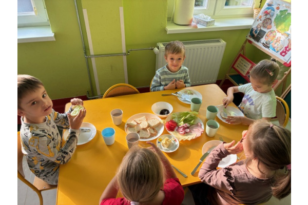 Dzień zdrowego śniadania w przedszkolu spodobał się dzieciom, ponieważ mogły same przygotować kanapki. „Kolorowe piramidy” rosły na talerzach. Zabawy ruchowe w ogrodzie przedszkolnym, to ulubione zajęcie przedszkolaków.